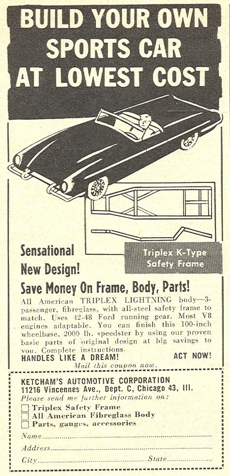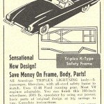 So Frank Hinger and Triplex were up and running in December 1953 with their own sports car frame, and hinting at a fiberglass body as part of the advertisement. The debut of their car – not yet designed or built was just 90 days away on March 13th, 1954 at the Chicago Auto Show.