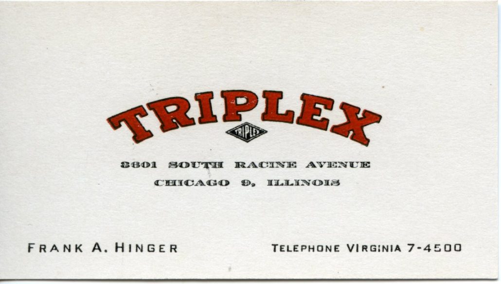 Information gleaned from the help of the Chicago Historical Society showed that a gentleman named “Frank Hinger” owned and operated “Triplex Industries.” And…they were a contemporaneous company of “Triplex Manufacturing,” but later research revealed that neither company knew of the other – even though they were blocks away from each other. Funny thing.