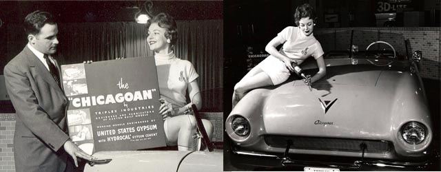 First exhibited at the 1952 (actually 1954) Chicago Automobile Show was the Chicagoan, built by Triplex Industries of Blue Island Illinois. The 2100 pound car was 14 and ½ feet long and had a 100 inch wheelbase. The fiberglass body and custom designed frame of the car was supposed to be able to take any V8 engine of the era, though it appears that most Chicagoans were equipped with 6 cylinder Willys blocks.
