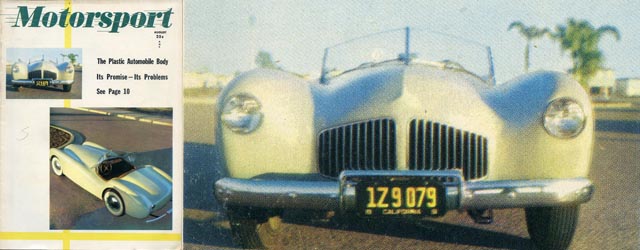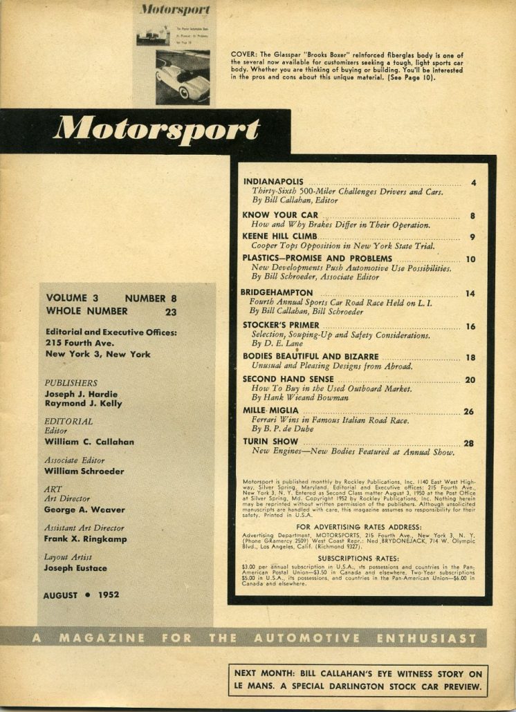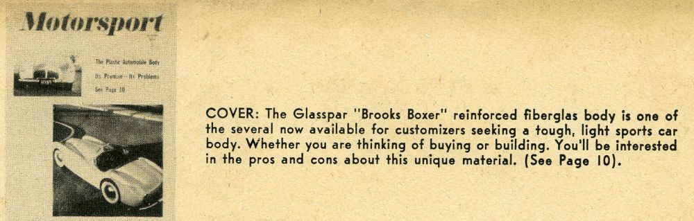 The first Glasspar G2 – also known as the “Brooks Boxer” – was featured on the cover of Motorsport in August of 1952. On the inside cover are the following words: