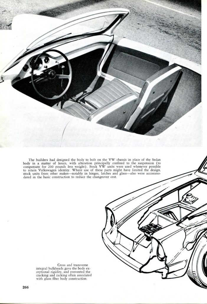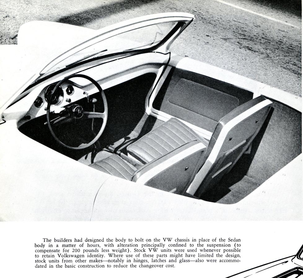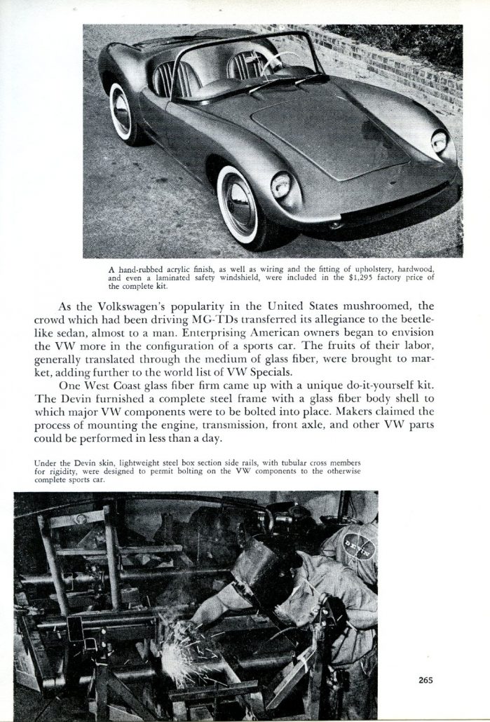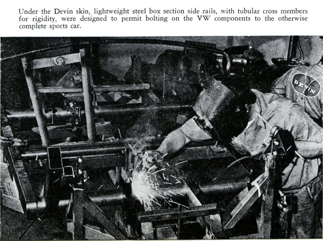 The fruits of their labor, generally translated through the medium of glass fiber, were brought to market, adding further to the world list of VW Specials. One West Coast glass fiber firm came up with a unique do-it-yourself kit. The Devin furnished a complete steel frame with a glass fiber body shell to which major VW components were to be bolted into place. Makers claimed the process of mounting the engine, transmission, front axle, and other VW parts could be performed in less than a day.