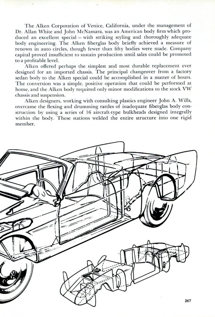 The conversion was a simple, positive operation that could be performed at home, and the Alken body required only minor modifications to the stock VW chassis and suspension. Alken designers, working with consulting plastics engineer John A. Wills, overcame the flexing and drumming rattles of inadequate fiberglass body construction by using a series of 16 aircraft bulkheads designed integrally within the body.