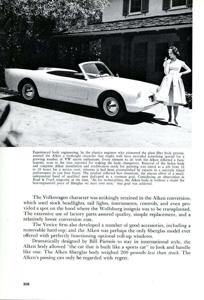 The Alken Corporation of Venice, California, under the management of Dr. Allan White and John McNamara, was an American body firm which produced an excellent special – with striking styling and thoroughly adequate body engineering. The Alken fiberglass body briefly achieved a measure of renown in auto circles, though fewer than fifty bodies were made.