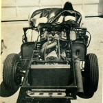 Caption: Engine compartment houses 354 cubic inch Chevy stroked 5/8ths and bored 5/16ths. Racer Brown roller cam pops its valves, while pistons are Forged True using Grant rings. A 6-72 GMC blower puffs through a Potvin manifold mounting Hillborn injectors. Scheifer flywheel and clutch assembly carries “go” to Halibrand QC rear. Gas-burner puts out 600 horses! Hydraulic cylinders control rakes, clutch, and accelerator linkage. Frame is of seamless tubing.