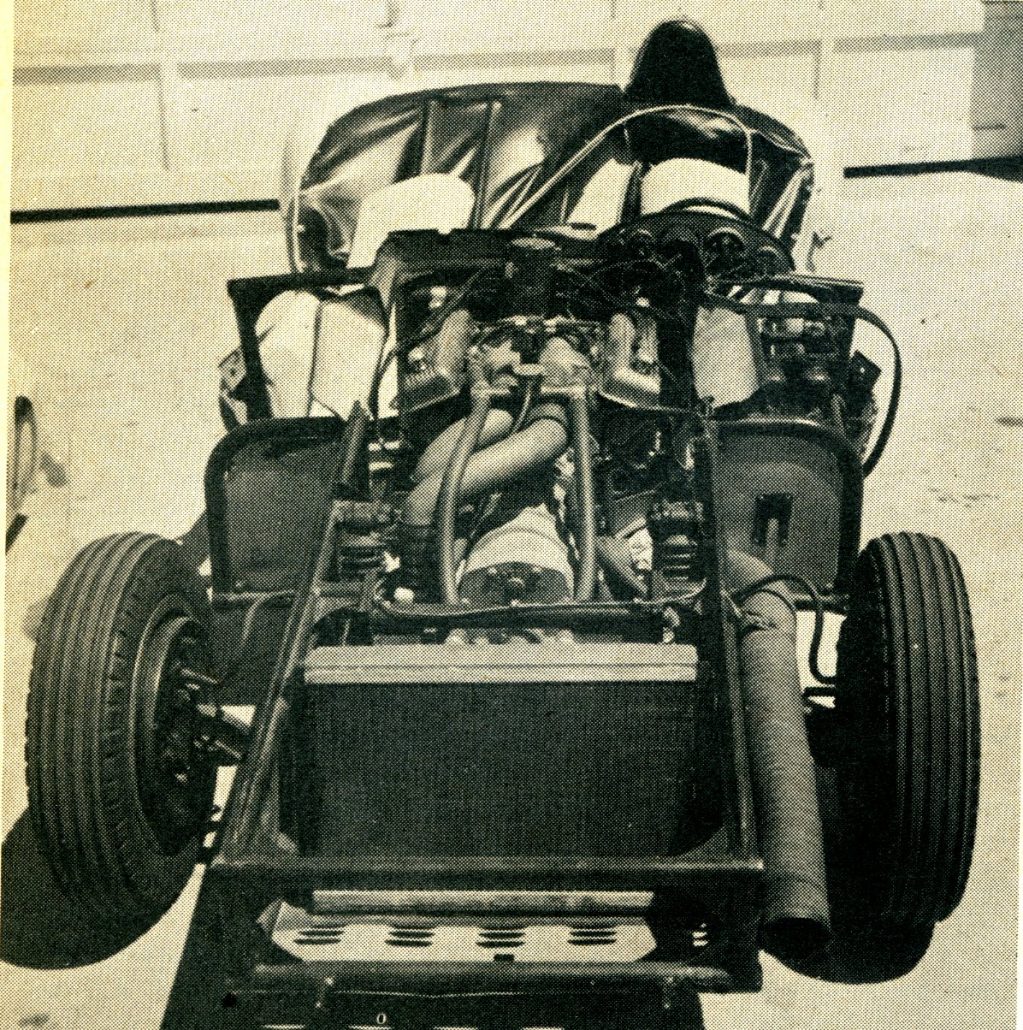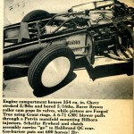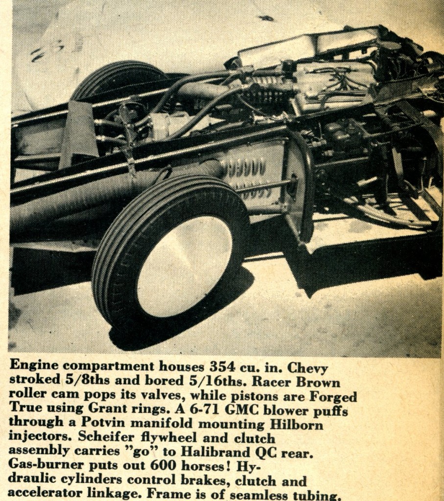 - Caption: Engine compartment houses 354 cubic inch Chevy stroked 5/8ths and bored 5/16ths. Racer Brown roller cam pops its valves, while pistons are Forged True using Grant rings. A 6-72 GMC blower puffs through a Potvin manifold mounting Hillborn injectors. Scheifer flywheel and clutch assembly carries “go” to Halibrand QC rear. Gas-burner puts out 600 horses! Hydraulic cylinders control rakes, clutch, and accelerator linkage. Frame is of seamless tubing.