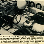 Caption: Shocks are Monroe all around. Wheel spindles are ’48 Ford modified for thrust-type bearings. Lincoln-Bendix brakes, ’48’s, are used up front while ’60 Merc-Bendix binders stop the rear wheels. The Moonbeams’s “office” is simple and functional with snap-off doors allowing quick removal of the car’s forward body section for engine accessibility.