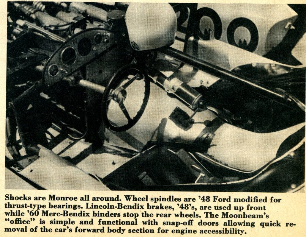 - Caption: Shocks are Monroe all around. Wheel spindles are ’48 Ford modified for thrust-type bearings. Lincoln-Bendix brakes, ’48’s, are used up front while ’60 Merc-Bendix binders stop the rear wheels. The Moonbeams’s “office” is simple and functional with snap-off doors allowing quick removal of the car’s forward body section for engine accessibility.