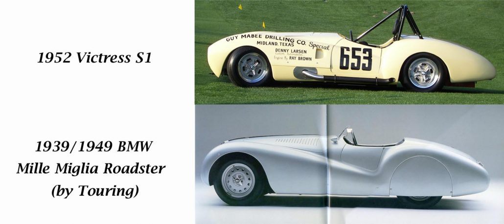 - Here’s The Profile Of The BMW 328 Mille Miglia. You Can Note The Similarity Of It To The Victress S1 In Many Ways. Keep In Mind That The Wheelbase of the BMW Was Just 94.5 Inches – Nearly Identical to the Smaller Fiberglass Cars of the 1950’s Which Had A 94 Inch Wheelbase.