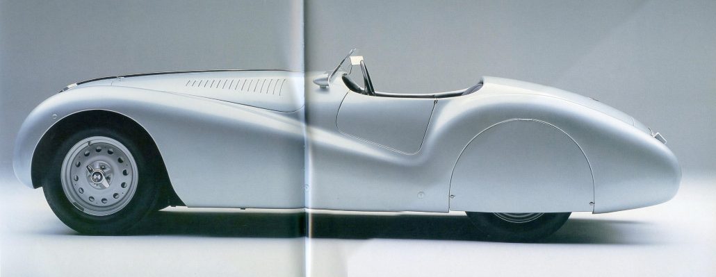 There is a certain conservatism in the lines of the roadster – and in the Jaguar inspired by it – in that the front and rear wings (another term for fenders) are kept clearly separate. Certain other aerodynamic cars of the period, and specifically the winning BMW Touring coupe, had pure pontoon forms, with no separate indication of front and rear wheelhouses.