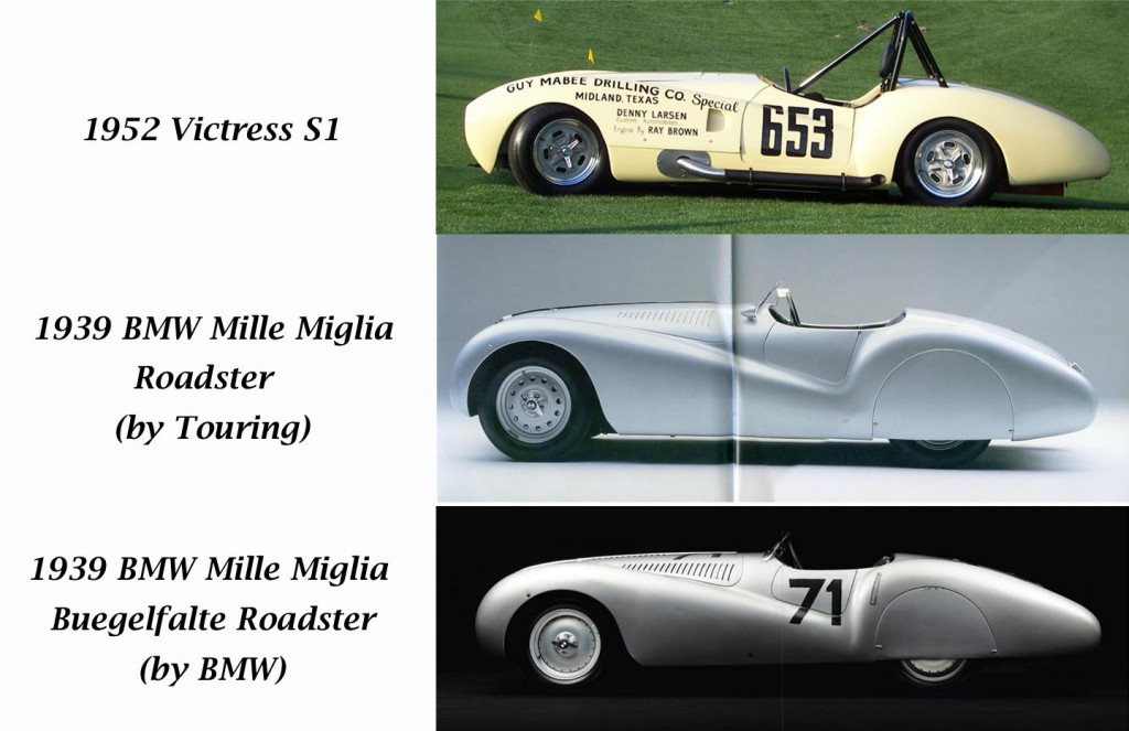 2 Published March 6, 2011 at 1030 × 667 in Designs That Influenced The Styling Of The Victress S1 And Glasspar G2: Part 3 – The 1939 BMW 328 Mille Miglia “Buegelfalte” Roadster Here’s A More Focused Comparison. Both BMW Roadsters Are Shown Here With The Victress Side Profile At The Very Top. You Can See The Victress and The Buegelfalte Roadster Share The Same Long Tail Designed By Dr. Kamm.