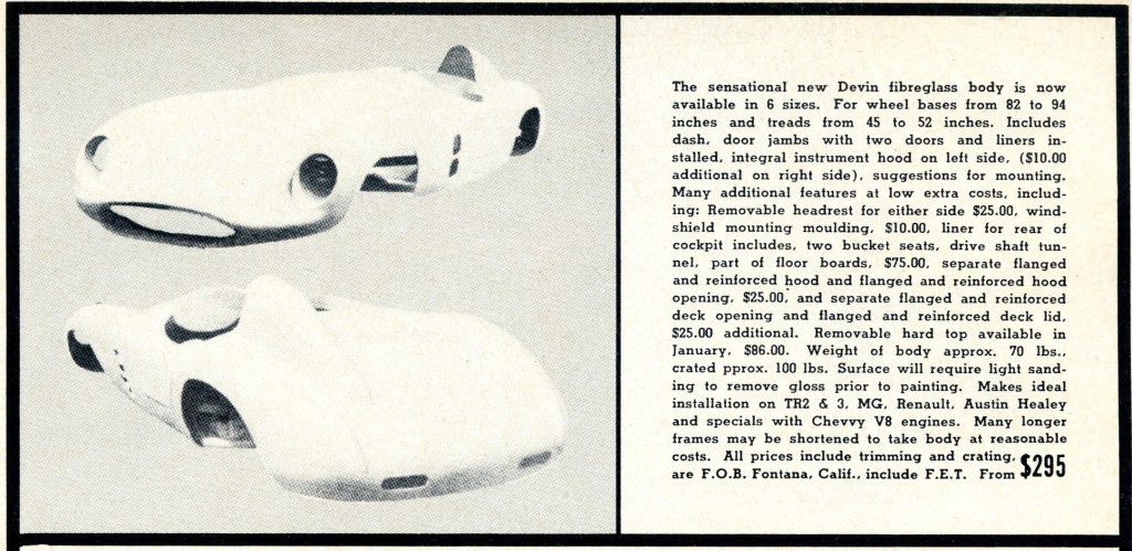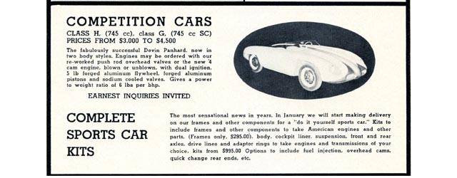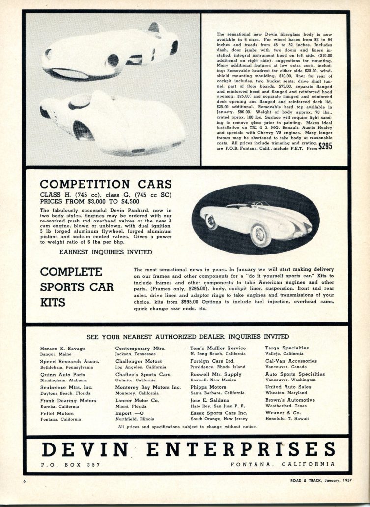 Devin took out a full page ad in Road and Track, January 1957. The ad covered 3 topics: