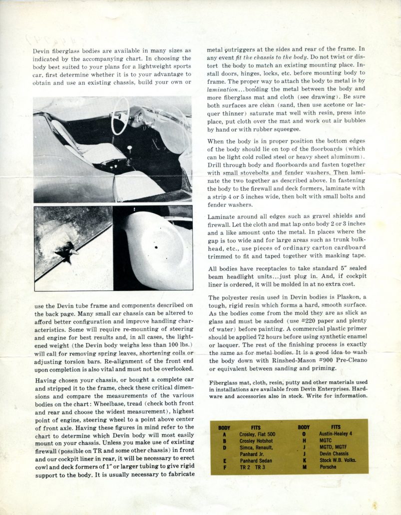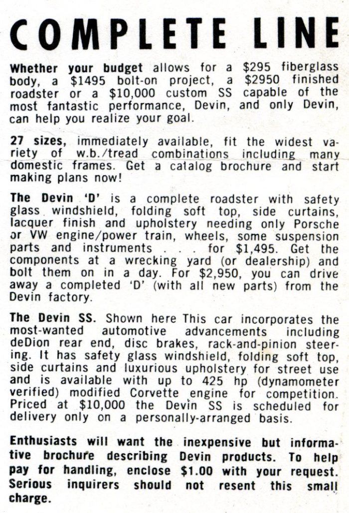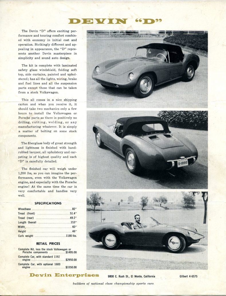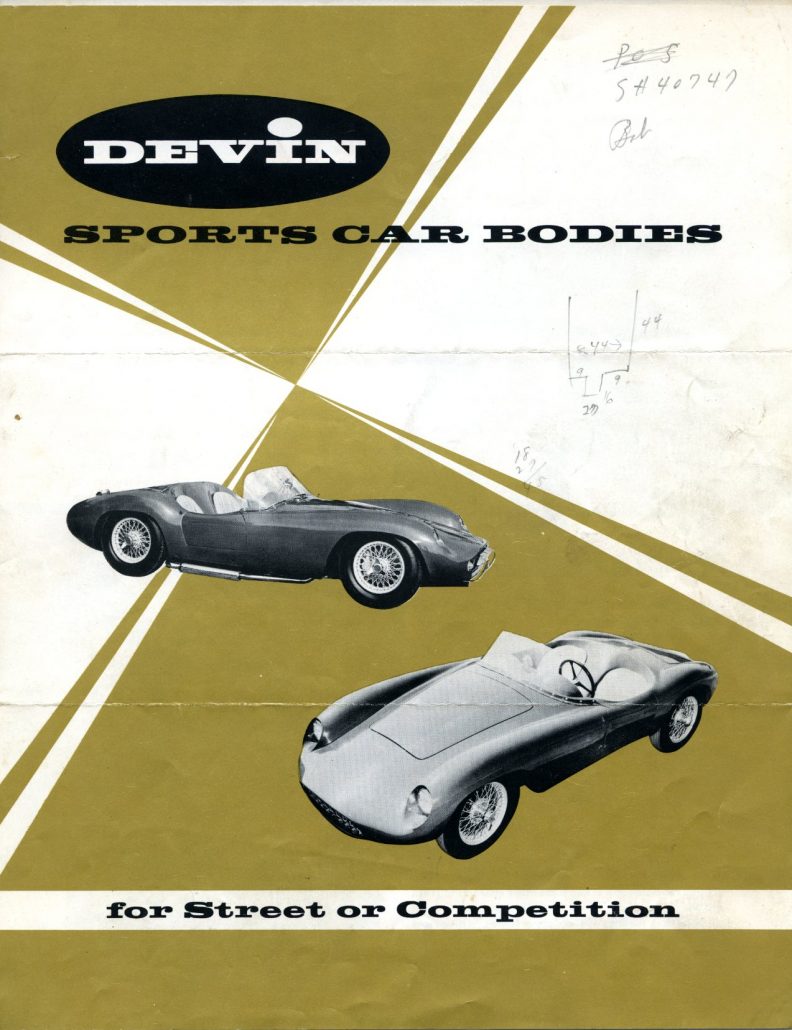 Recently I came across a 4 page Devin brochure from around 1960, and the back page was dedicated to showcasing the Devin “D.”  Here are a few tasty tidbits of what the brochure had to say: