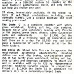 “The newest addition to the line, and “baby” of the shop, is the Devin D, a revolutionary “kit car” conception.  Unlike kits of the past, the D model is complete with laminated safety glass windshield, folding soft top, side curtains, a hand-rubbed lacquer body, upholstery, leather-covered bucket seats, chrome bumpers, brake and fuel lines, all working, head and tail lights, parking and directional lights, and a built-in heavy-duty frame.