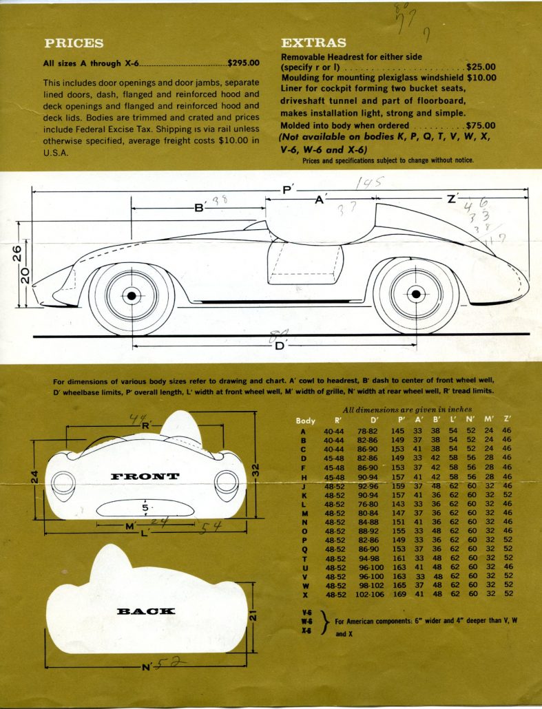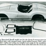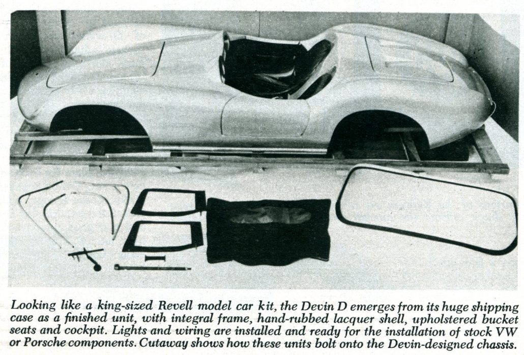 It arrives in a huge shipping carton ready for the installation of stock Volkswagen or Porsche components.  These stock units bolt on, with no welding, drilling, or cutting necessary.  In this kit form, the D model is priced at $1495.  If purchased as a complete car, with new VW engine and running gear, the car is tagged at $2950.”