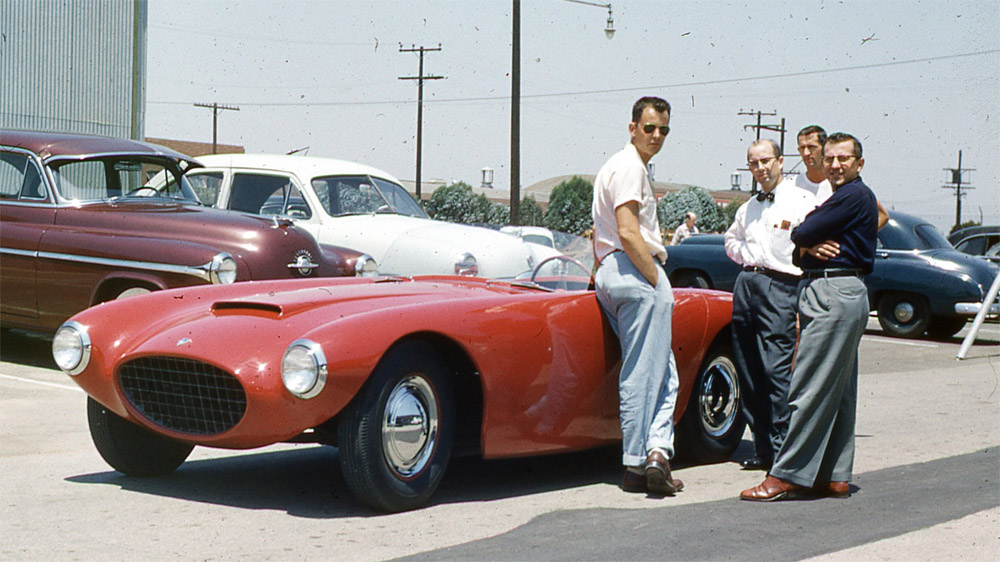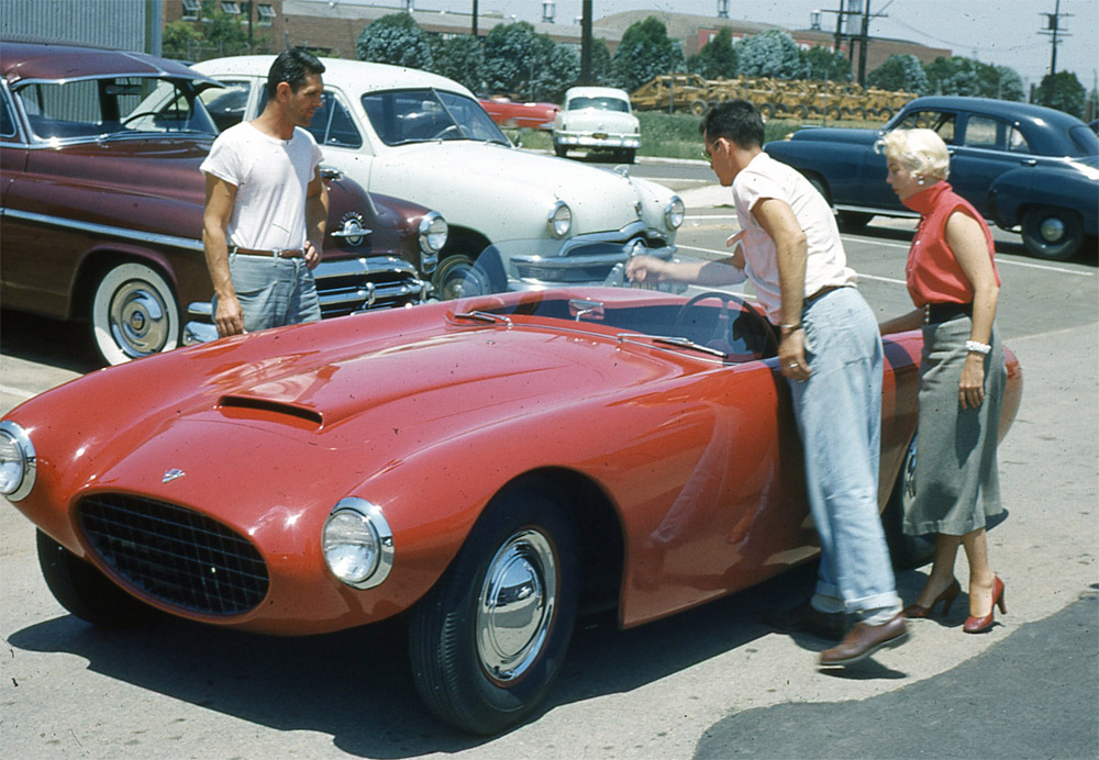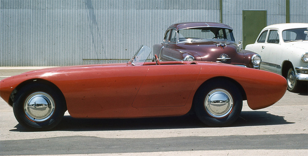 Check out that windshield gang. In ’53, the wrap around windshield from the Corvette, ’53 Eldorado, and other GM products were not yet readily available. Dick actually fiberglassed a channel into the body for the glass that was used to fit the car in these pictures.