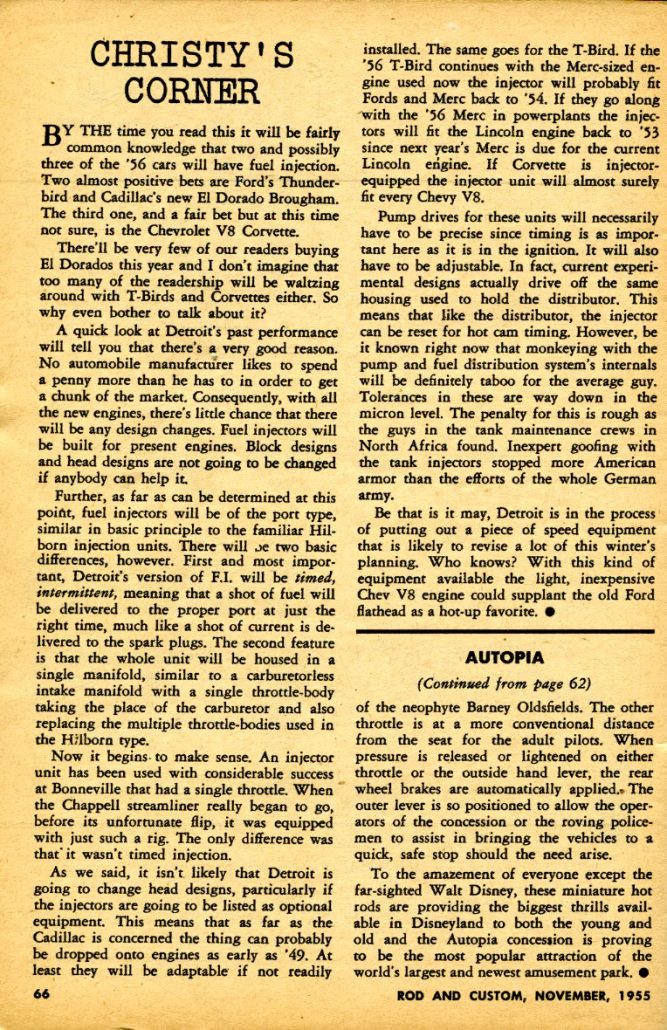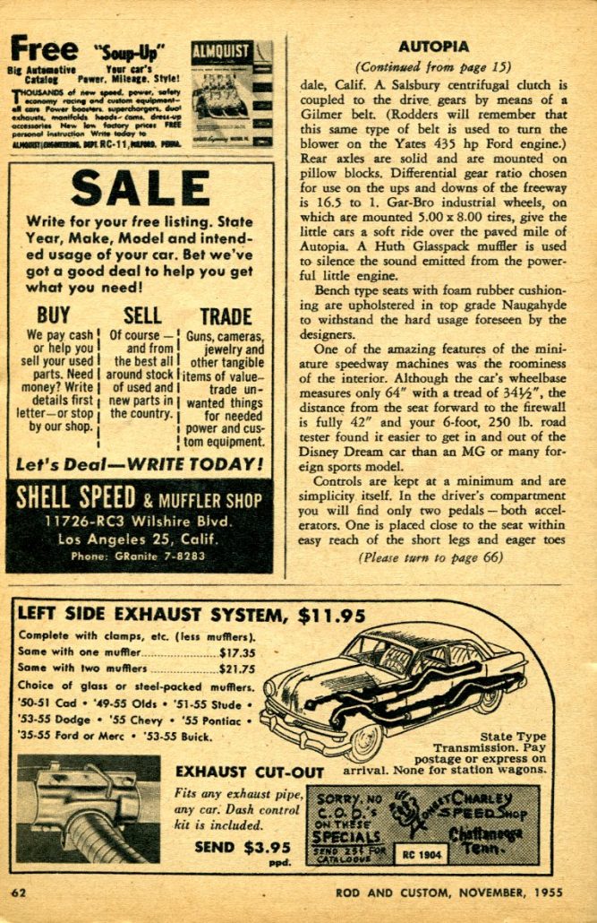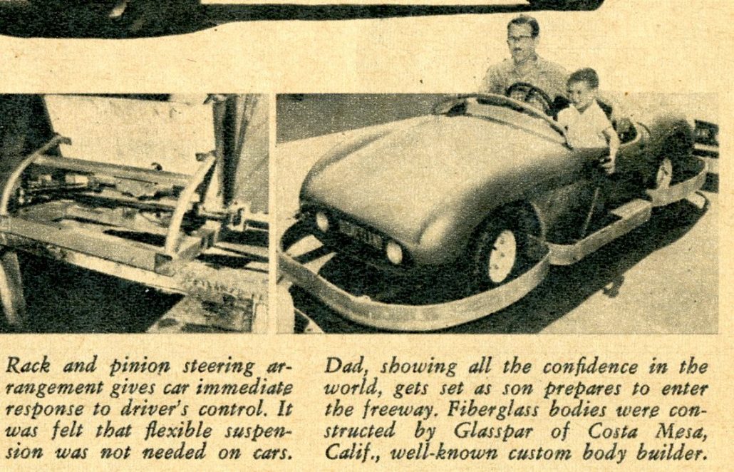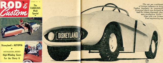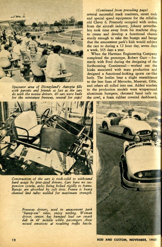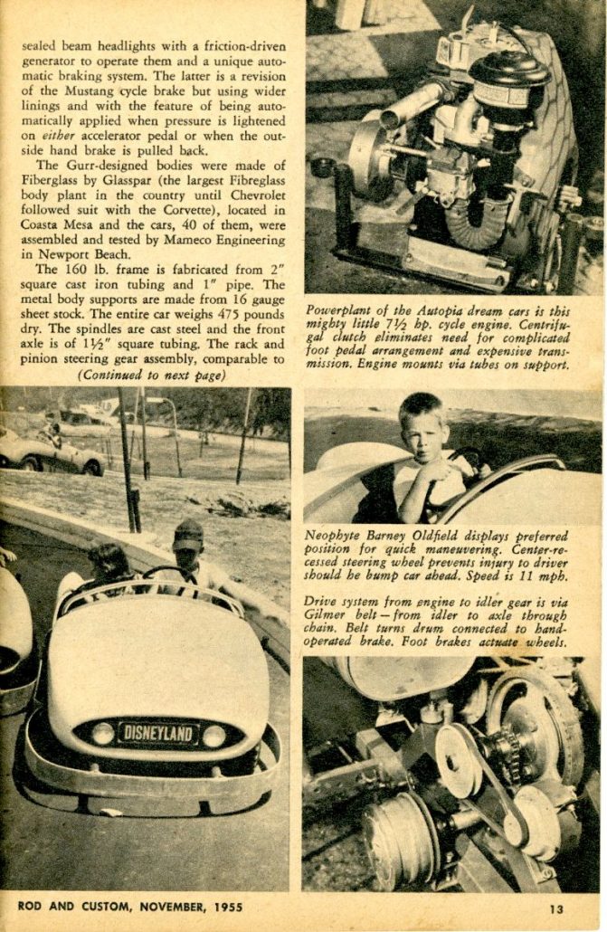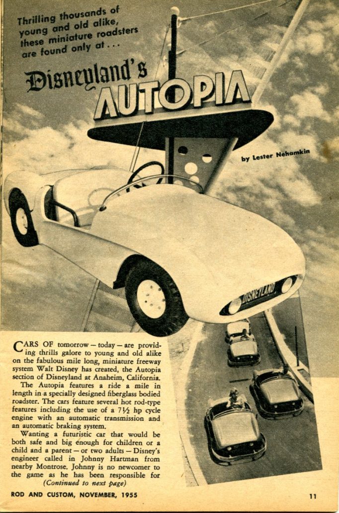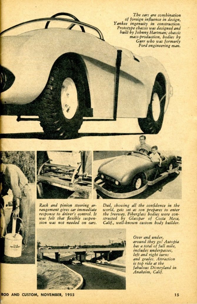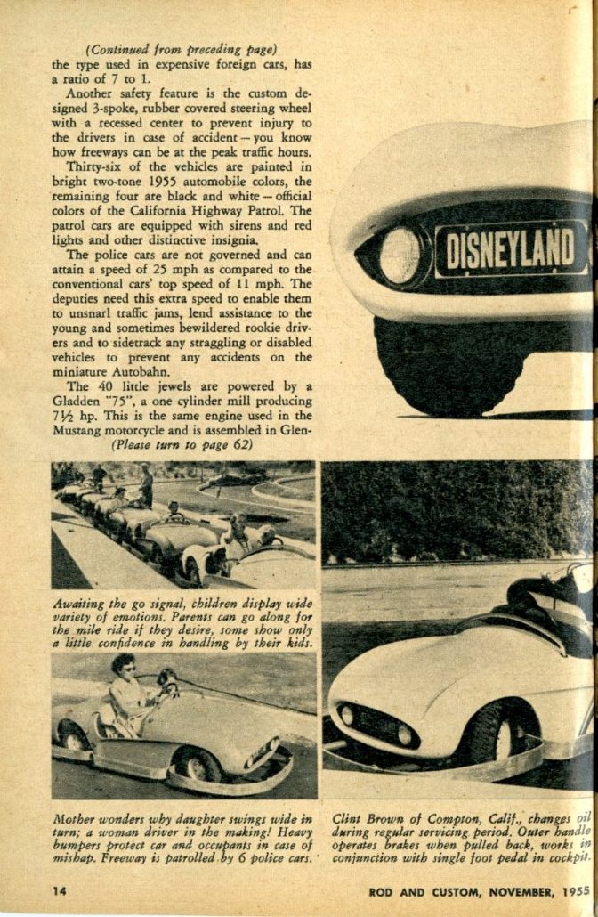 And today, we have a great article which stitches together all of these folks and adds more detail.  So, for you fiber fans out there, let’s see what Rod & Custom Magazine had to say about Disney’s Autopia ride in November ’55 – just 5 months after Disney opened in July of the same year.