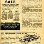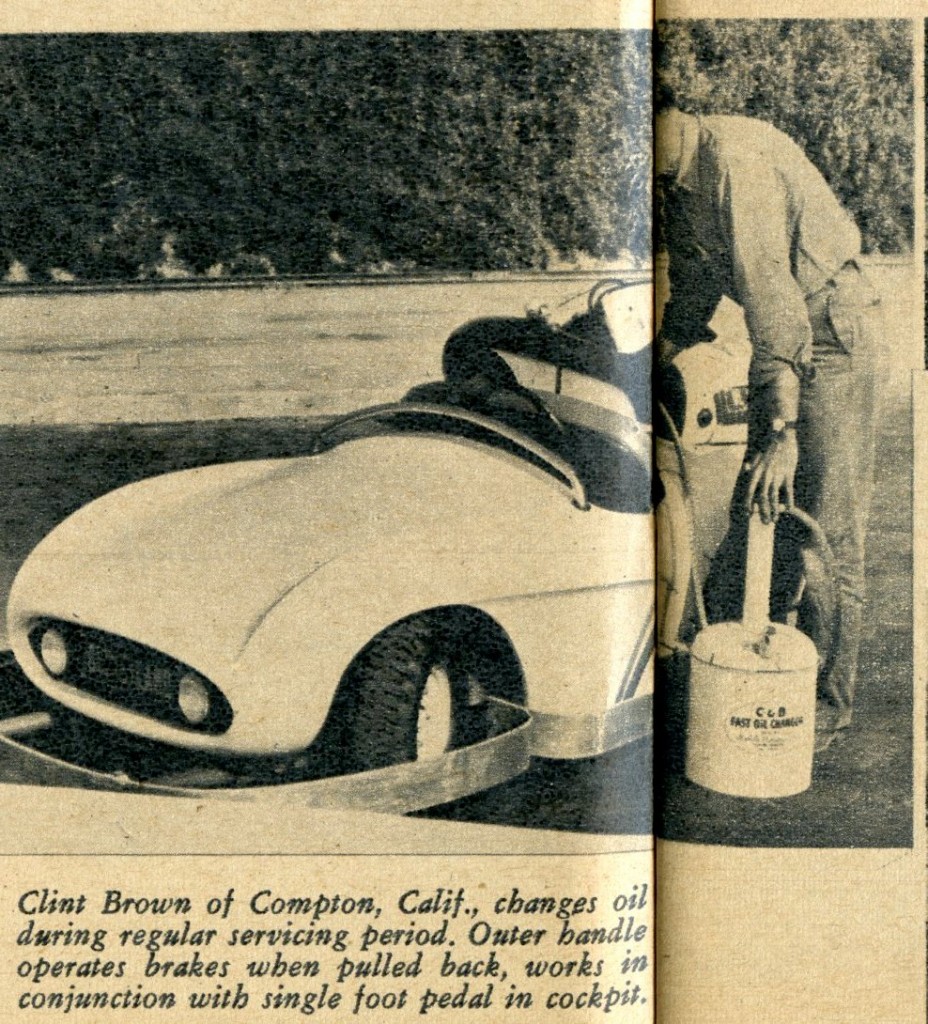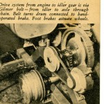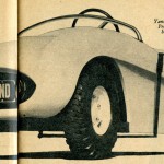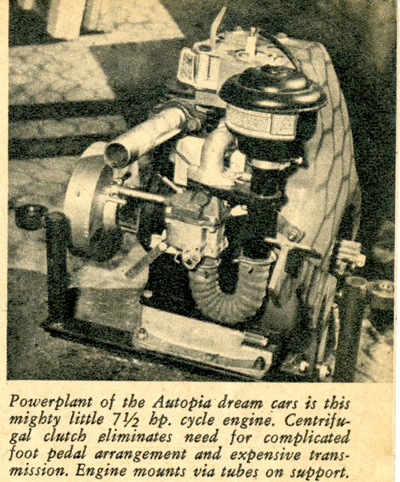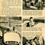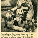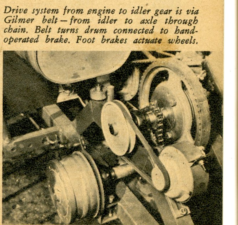 The 40 little jewels are powered by a Gladden “75”, a one cylinder mill producing 7 1/2 hp.  This is the same engine used in the Mustang motorcycle and is assembled in Glendale, Calif.  A Salsbury centrifugal clutch is coupled to the drive gears by means of a Gilmer belt.  (Rodders will remember that this same type of belt is used to turn the blower on the Yates 435 hp Ford engine.)