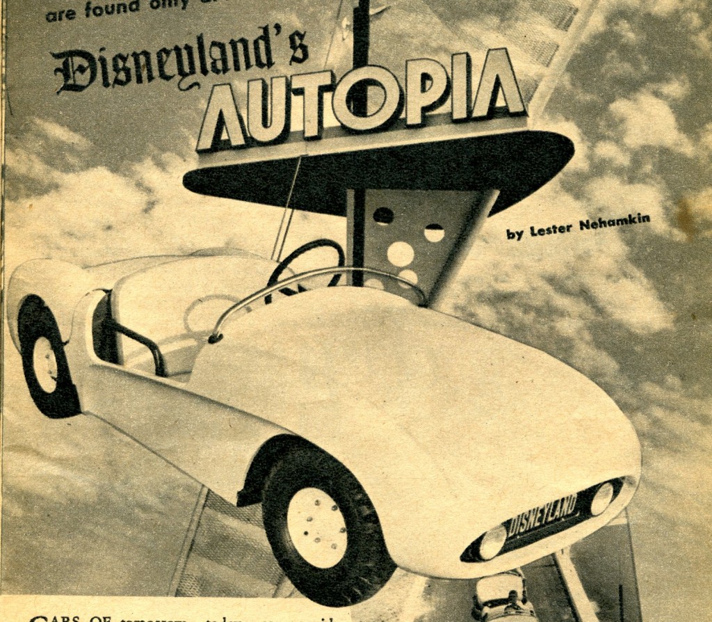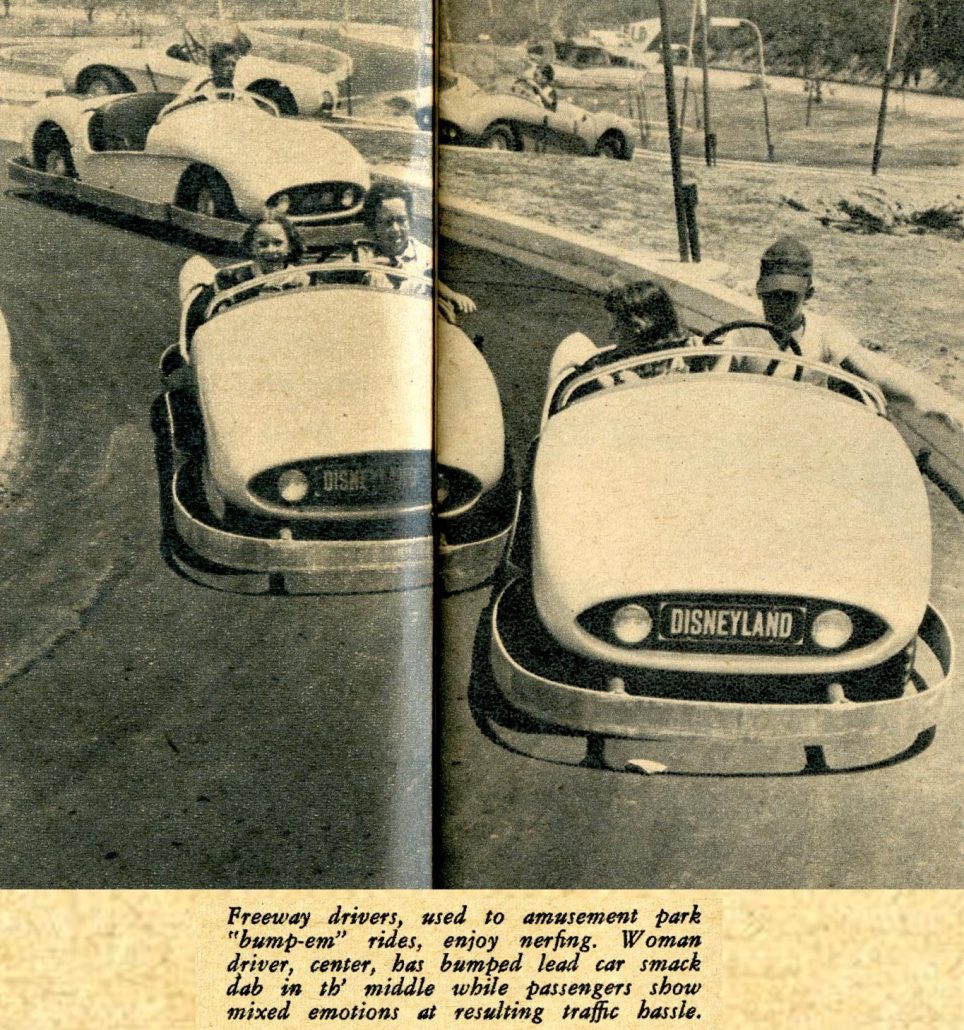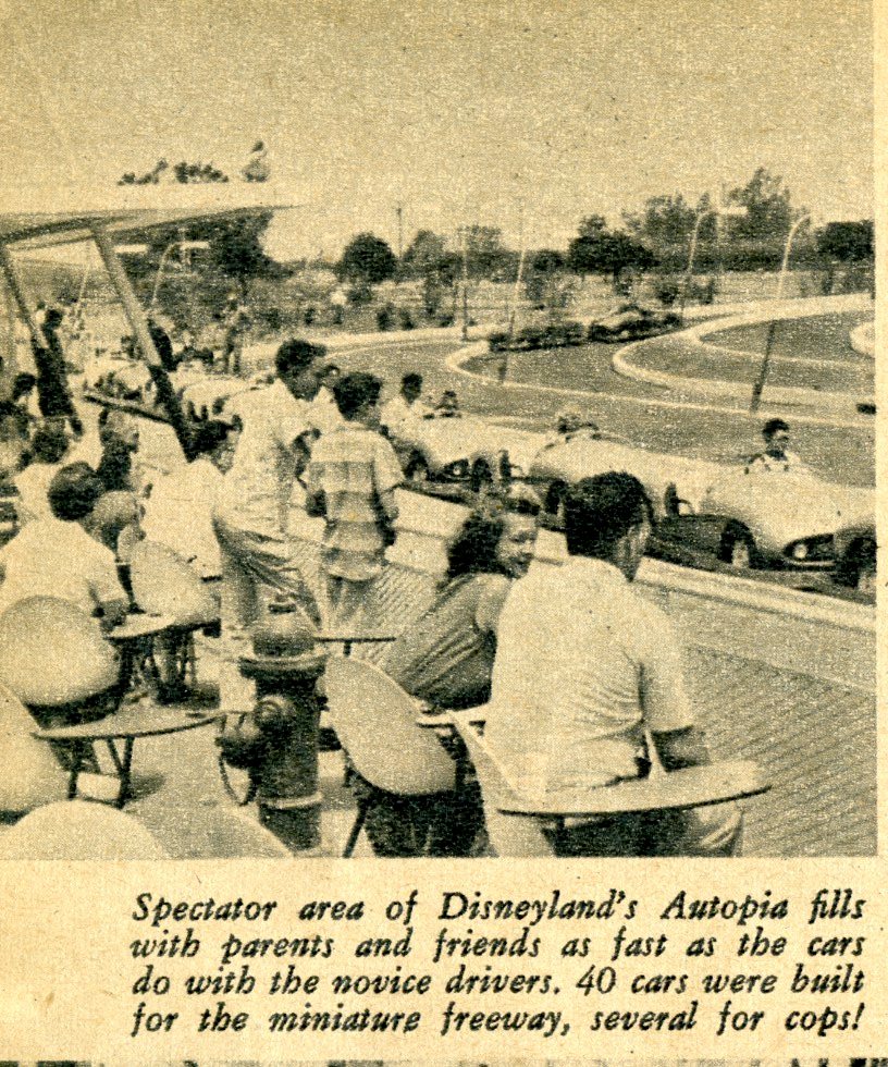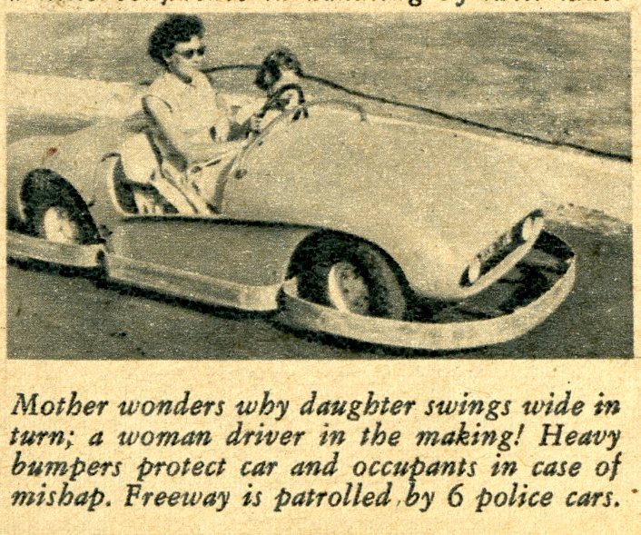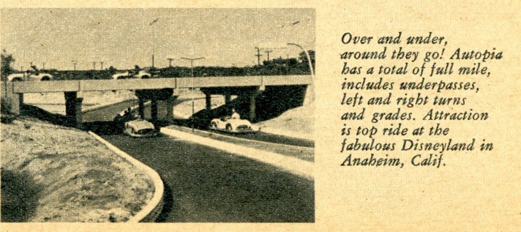 Cars of tomorrow–today–are providing thrills galore to young and old alike on the fabulous mile long, miniature freeway system Walt Disney has created, the Autopia section of Disneyland at Anaheim, California.