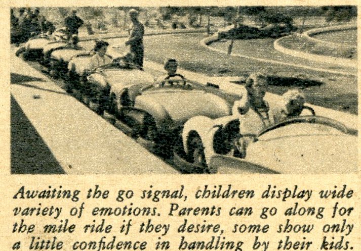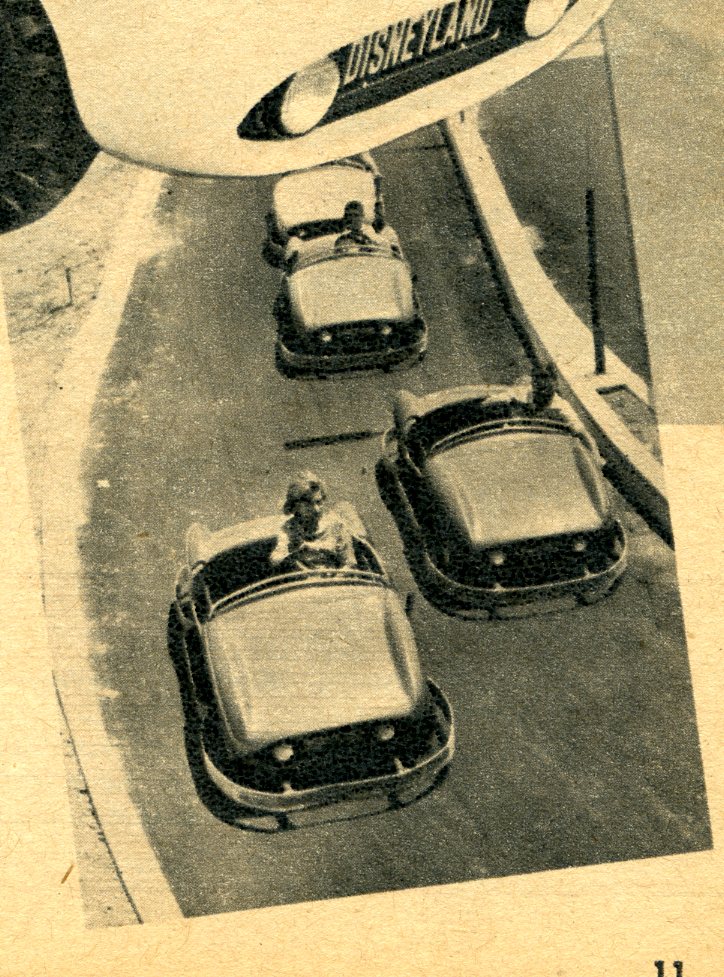 To the amazement of everyone except the far-sighted Walt Disney, these miniature hot rods are providing the biggest thrills available in Disneyland to both the young and old and the Autopia concession is proving to be the most popular attraction of the world’s largest and newest amusement park.