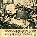 The 160 lb. frame is fabricated from 2″ square cast iron tubing and 1″ pipe.  The metal body supports are made from 16 gauge sheet stock.  The entire car weighs 475 pounds dry.  The spindles are cast steel and the front axle is of 1 1/2″ square tubing.  The rack and pinion steering gear assembly, comparable to the type used in expensive foreign cars, has a ratio of 7 to 1.
