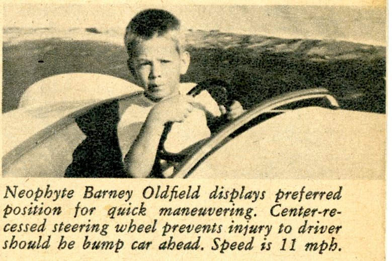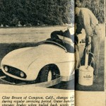 One of the amazing features of the miniature speedway machines was the roominess of the interior.  Although the car’s wheelbase measures only 64″ with a tread of 34 1/2″, the distance from the seat forward to the firewall is fully 42″ and your 6-foot, 250 lb. road tester found it easier to get in and out of the Disney Dream car than an MG or many foreign sports models.