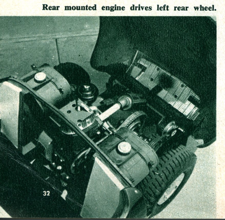 Controls are unique, for there are two accelerator pedals so located that either may be used conveniently according to one’s leg length. There is also a long external lever to allow adult overrule of impatient young throttle stompers at the beginning of the one mile ride.
