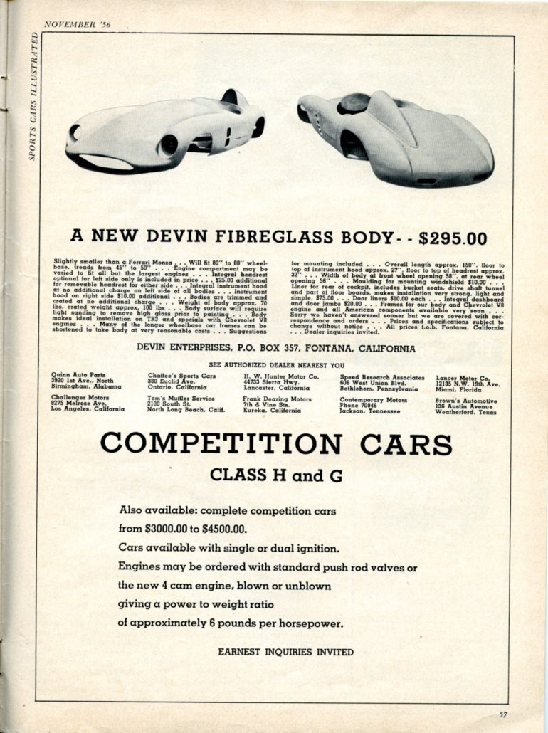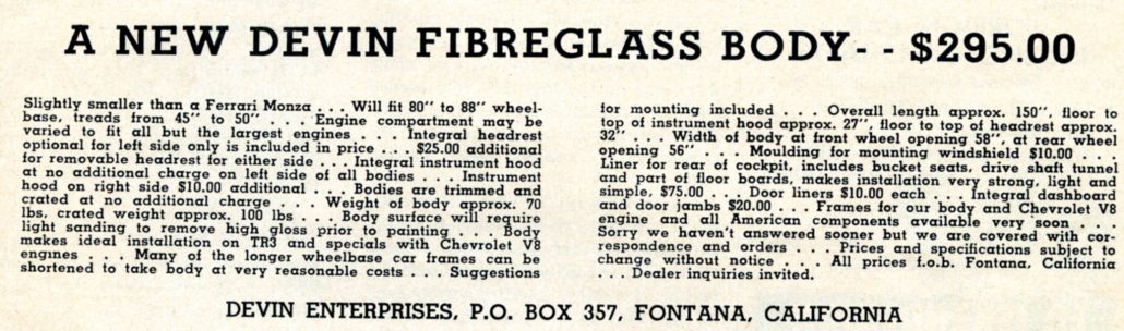 Early Devin Ad 1956 – “ A New Devin Fibreglass Body – $295”