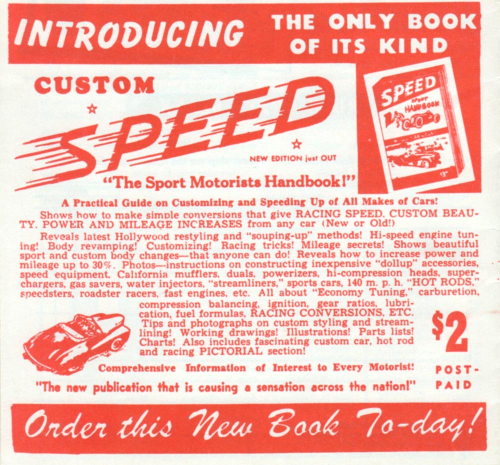 This was more than two years before Hot Rod Magazine came out, so it was a time when there were really no car magazines, so he advertised his book in Popular Mechanics in a 1-by-1-inch ad. The tiny ad brought in $200 in orders plus requests for speed equipment. It was a hit, something Ed never expected. Ed had found his calling.