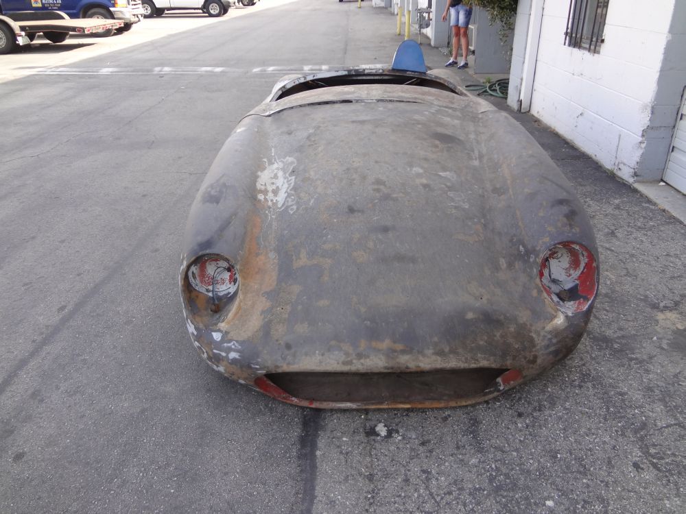 The front end of this particular CR90 has has been modified. It has a flip up style hood like an E-Jag or TVR instead of the conventional style hood found on the stock CR90 body. The body has been sanded mostly down to the glass, but remnants of the original paint remain. The car was originally painted red. It had a large white meatball on the hood and large white meatballs on the door area on both sides (the doors are not cut in).