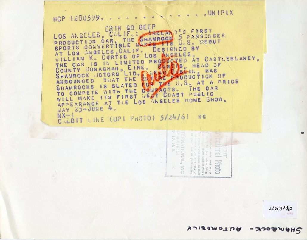 I recently found a press photo and caption discussing the debut of the production Shamrock in Los Angeles California. That darn Glenn Brummer costs me more and more money each and every week (Thanks Glenn!).