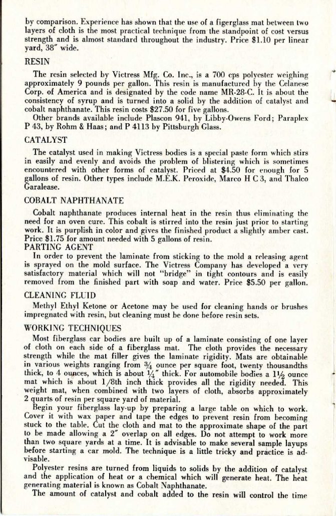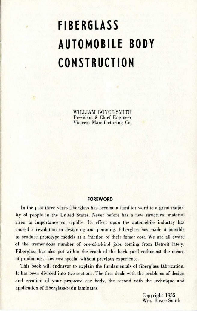 Doc was up to the task, and as President of Victress Manufacturing he wrote, designed and published two additional pieces of literature for potential and current Victress sports car builders.  Let’s review this first book published in ’55 by Victress and Doc Boyce-Smith (we’ll review the second one in a future story here at Forgotten Fiberglass).