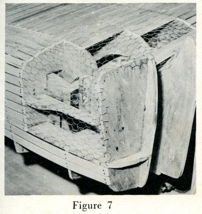 Here The Clay Buck Is Shown Fully Finished and Ready For Application of Masonite Mold Divider Sections. In Background is Laminating Table With Fiberglass Materials Laid Out On It Ready To Start (Merrill Powell, Comments).