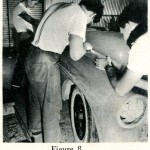 Morrie Chung (center) and Jim Dong (rear) Working on S4. Hugh Jorgensen is at Front of S4. At Bottom Left Corner of Picture Is Box of Clay Ready To Return The Oven To Be Reheated. All 3 Of Them Are Holding A Masonite Template Used As The Contour For The Ridge Of The Fender (Comments From Merrill Powell).
