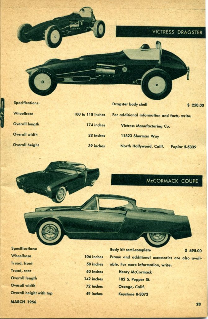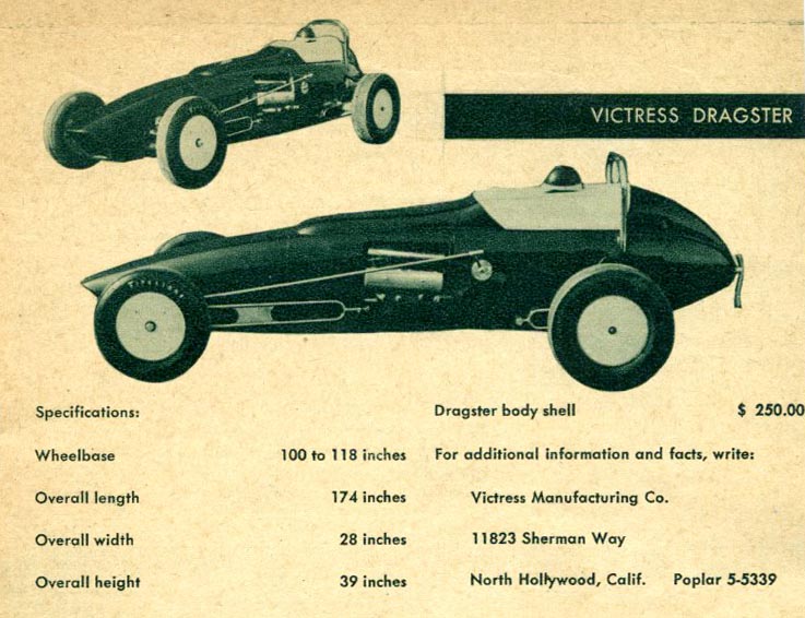 And….be on the lookout for a Victress Dragster “survivor.” If you find one, it will be the first known to exist, and you’ll have found one of the earliest – if not the earliest – fiberglass bodied dragster the world has ever known.