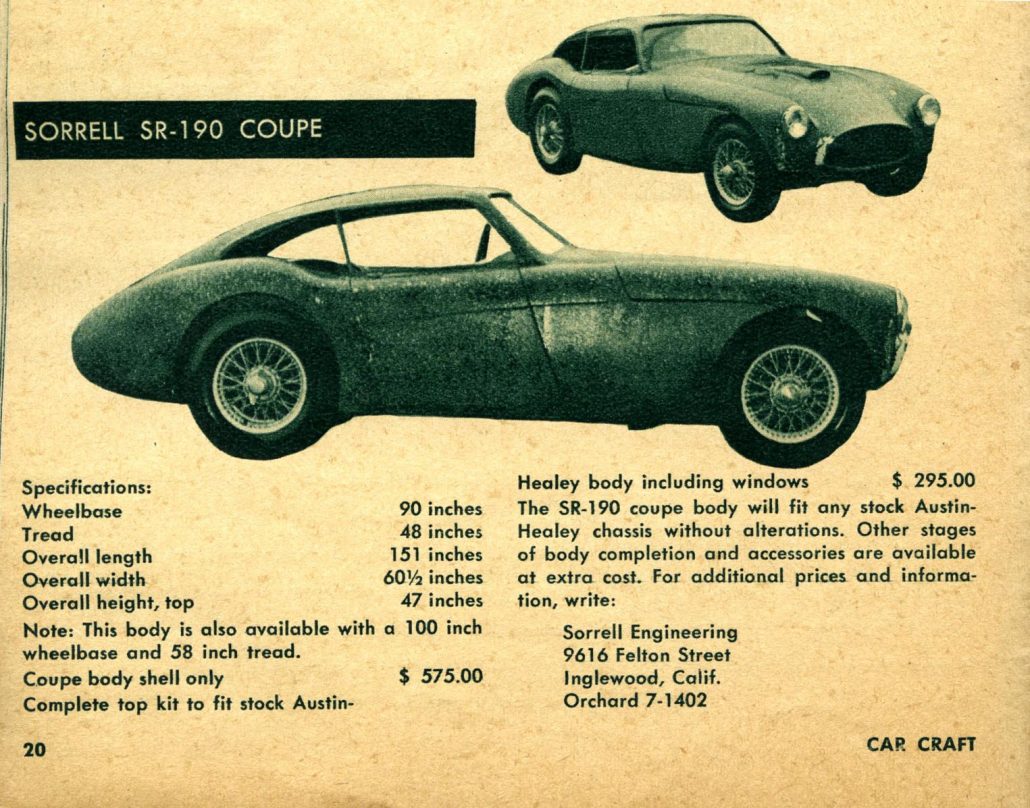 - Nice Picture of Stylish Sorrell SR-190 Coupe. The Hood Looks Like It Swings Opens – Clamshell Style – Similar To The Later Jaguar XKE.