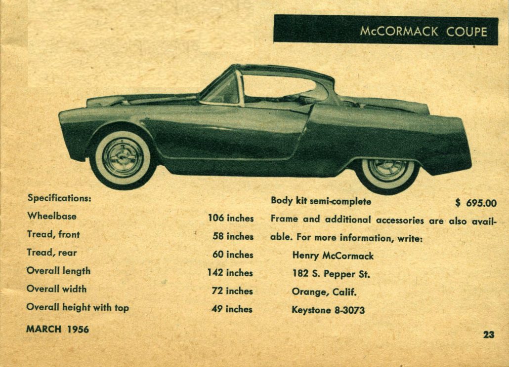 Today’s article focuses on the McCormack Coupe designed by Henry McCormack which debuted in November 1955 at the Petersen Motorama in Los Angeles, California.