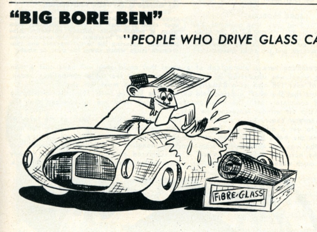 As Rick and I have canvassed thru reams of 1950’s magazines, we’ve found many cartoons that touch on – or directly relate to – building and driving fiberglass bodied sports cars. From time to time, we thought you might enjoy seeing some of these cartoons. So this makes today our second in a series focused on “Fiberglass Funnies.”