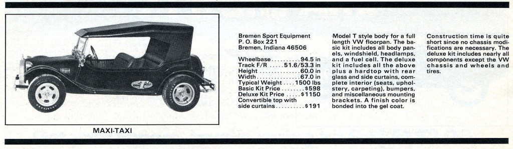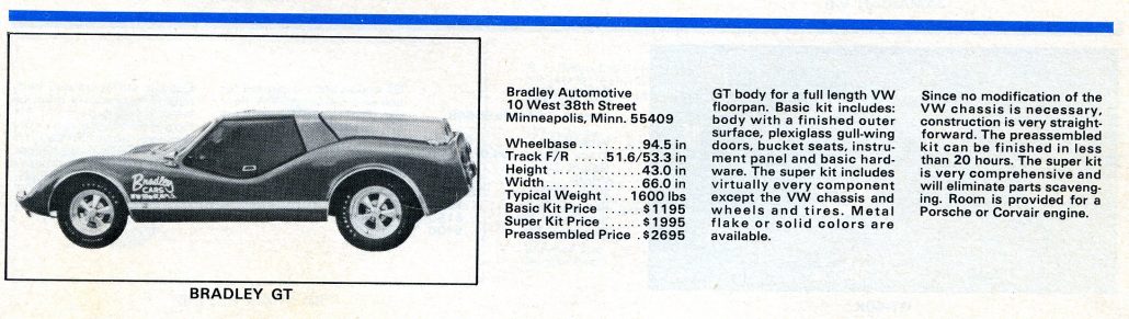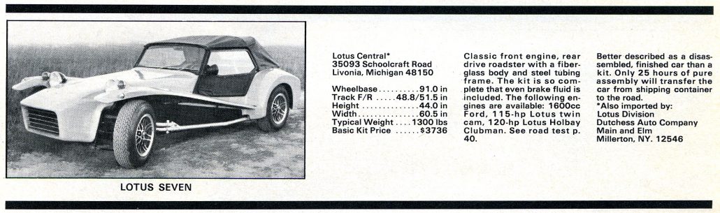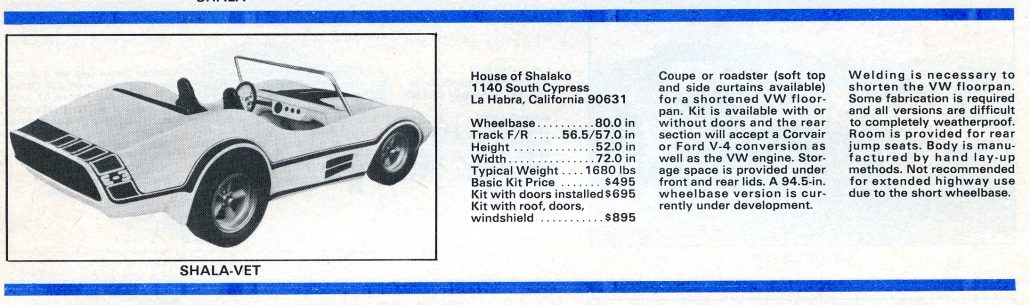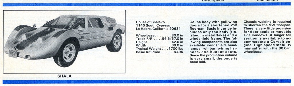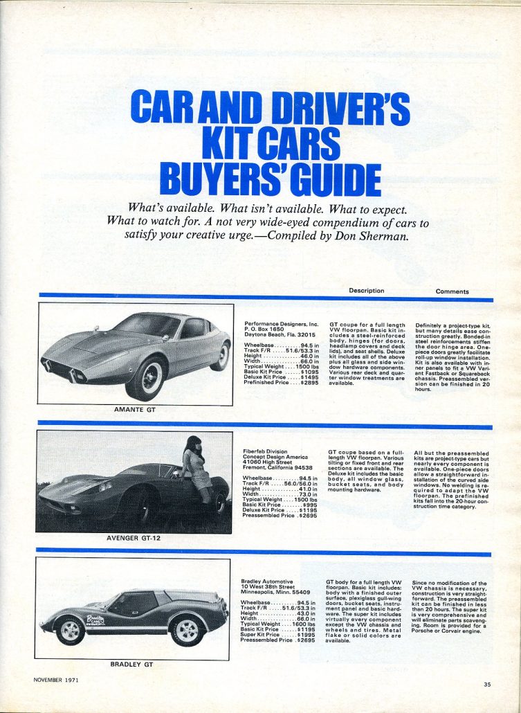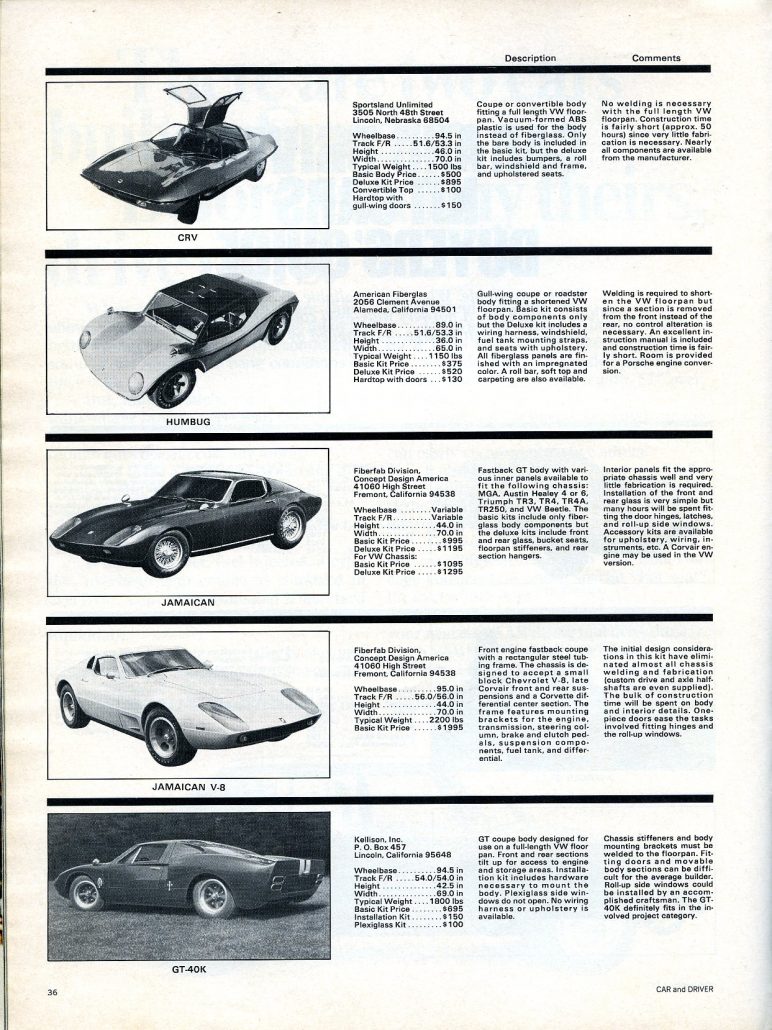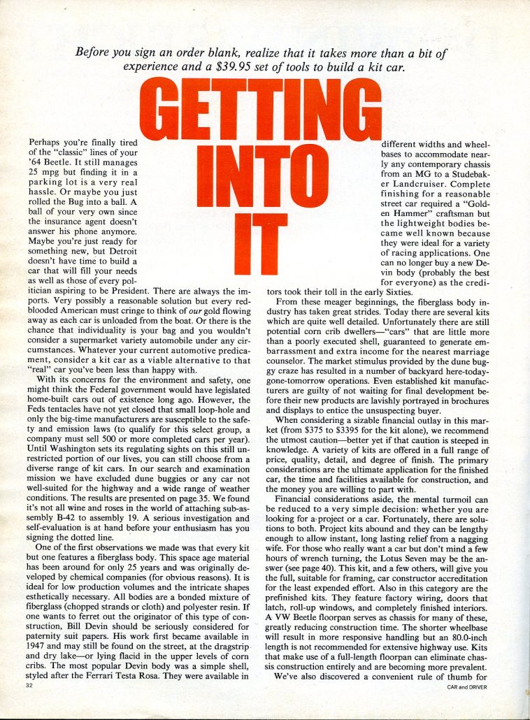 There is some excellent information shared here in Car and Driver Magazine, and this article represents what the “state of the industry” looked like for the “build it yourself” fiberglass sports car hobby going forward from 1971.  A bit of history concerning cars such as “Devin” was shared, but their assertion that Devin started to build fiberglass cars in ’47 was a bit too early.  So far, our research has shown that Devin’ started with his ’55 Devin-Panhard, and then in ’56 launched his now famous multi-sized body.