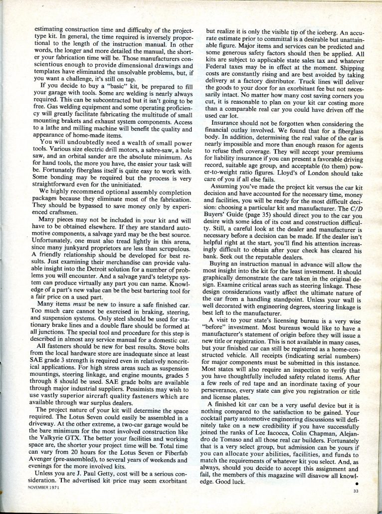 * The first half is a comprehensive article which identifies the tools, experience, insurance, licensing, time, and real costs associated with building a sports car in the early ‘70s.