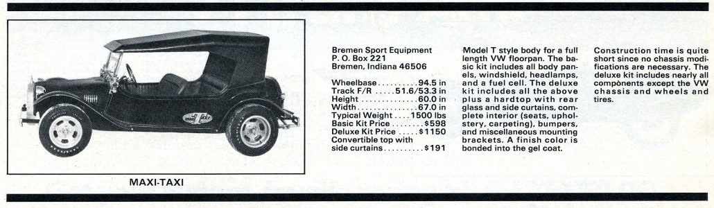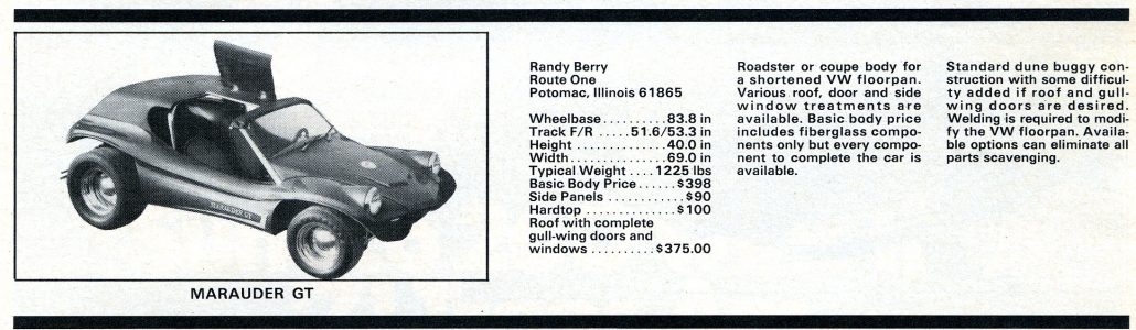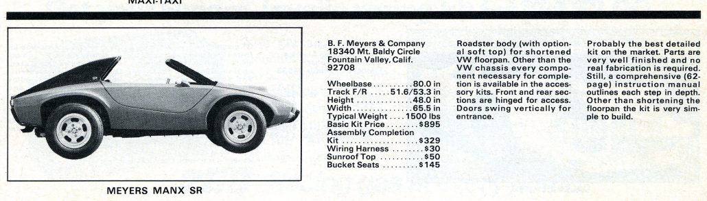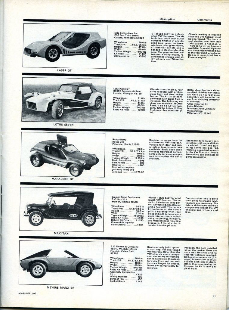 The market stimulus provided by the dune buggy craze has resulted in a number of backyard here-today-gone-tomorrow operations.  Even established kit manufacturers are guilty of not waiting for final development before their new products are lavishly portrayed in brochures and displays to entice the unsuspecting buyer.