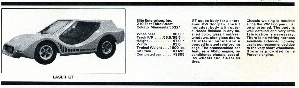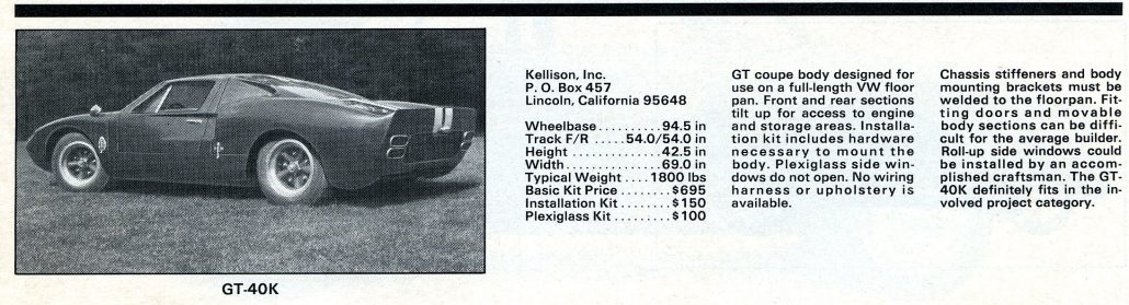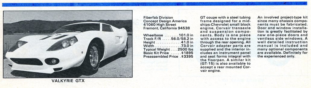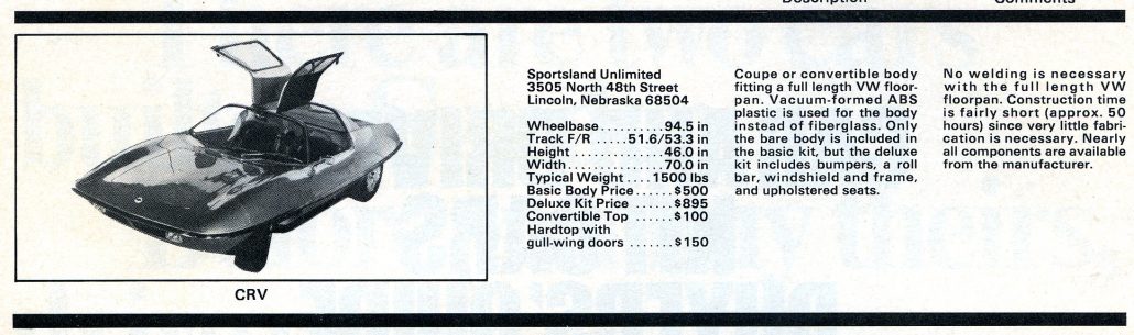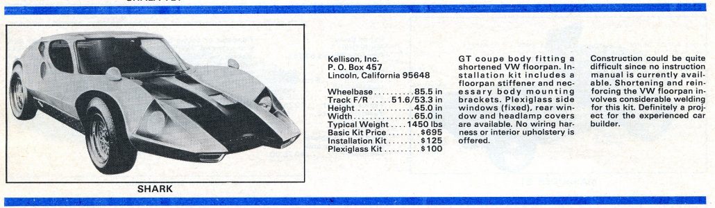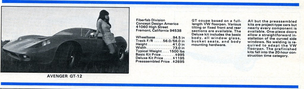 What’s interesting is that Kellison – a company covered in this article and still active at the time (not the case with “Devin” in the Buyer’s Guide) started in ’57 (perhaps earlier….still researching and confirming), and this history is not mentioned.  Nor is “Fiberfab” which started around ’64 with roots earlier in “Sports Car Engineering” in the late ’50s or CRV which started being advertised around ’65.