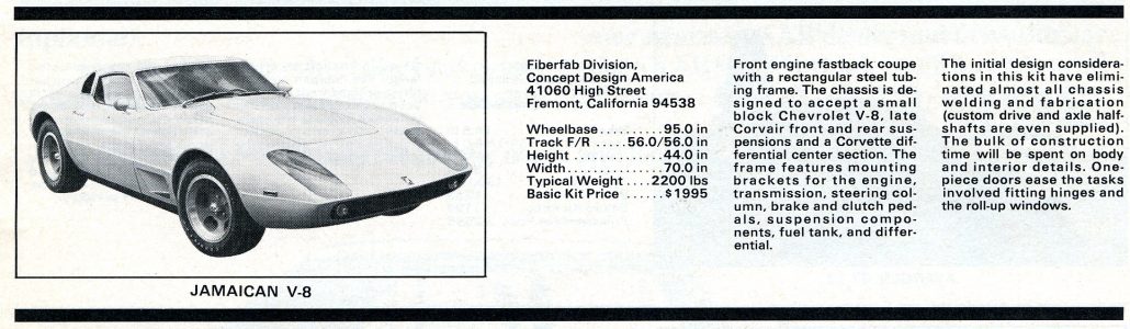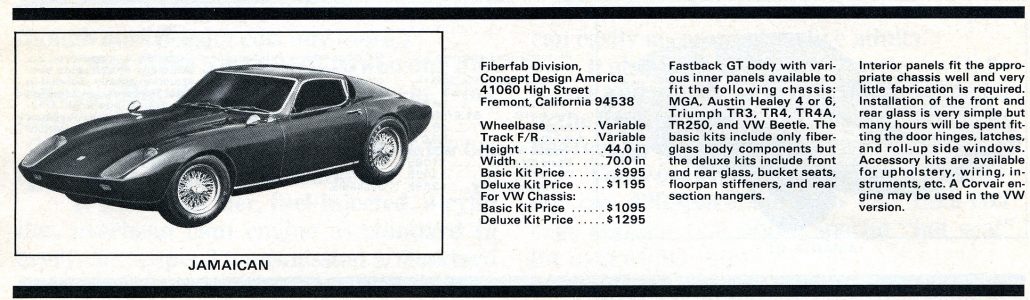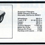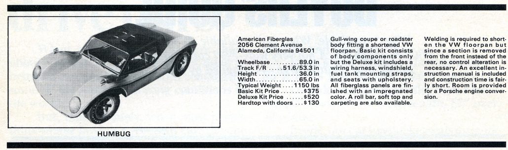 2. In my high school days (1967-71 – the height of the muscle car era) American Fiberglass (which manufactured the Humbug) was 2 short blocks & around the corner from where I lived in Alameda, Ca. At times I could catch the resin aromas wafting into our neighborhood. My friends & I enjoyed going there & watching a schoolmate employed there blowing glass into the mold with the chopper gun. We also enjoyed checking out other running kit cars that would frequent the shop. These included the Avenger GT-12, Valkyrie GTX, Jamaican, & the Jamaican V8 all from nearby Fiberfab Division in Fremont as well as the Sterling manufactured in (even closer) San Leandro. But my personal favorite was a Cheetah that showed up one day while we were there! There were others too like the Bradley & assorted dune buggys, but there was no escaping that the cars that held the most dream appeal were the V8 powered kits.