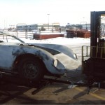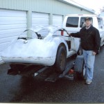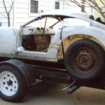 But, when I hit the brakes the J-2 broke the rear tie down strap and moved forward and over the built in trailer front tire support. The front tire was now resting in front of the tire stop. The car would have to be lifted up 10” and pulled back at the same time. I couldn’t reload the car as I didn’t have the means to do it. By pure chance the front cross member of the J-2 chassis was now sitting on the trailer tongue. The car is very secure as it sits on the tongue with no chance of the body or frame moving or either being damaged.