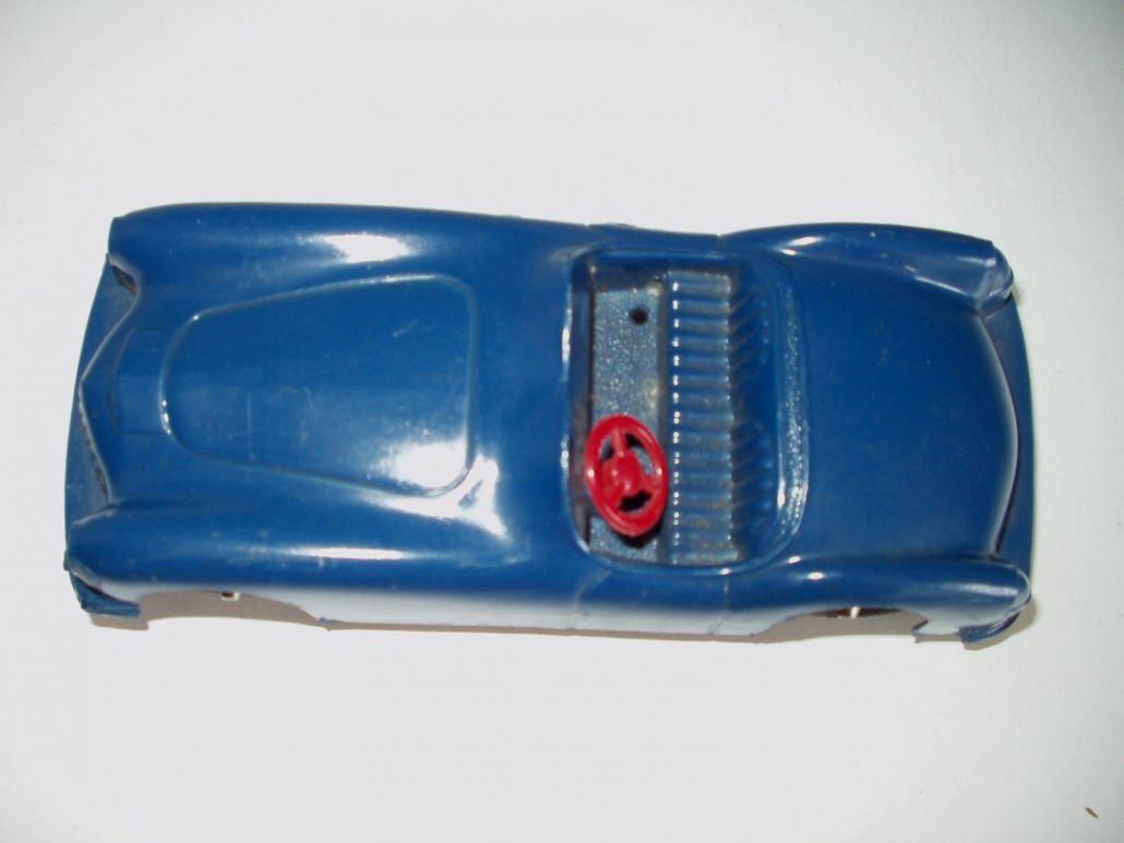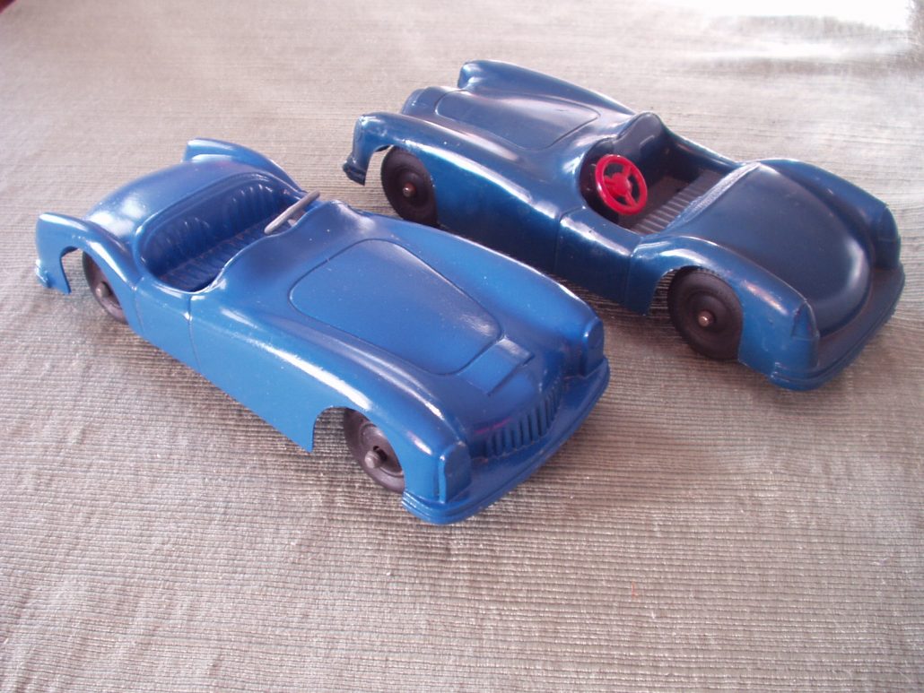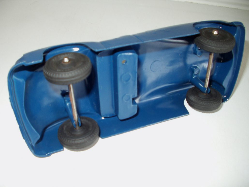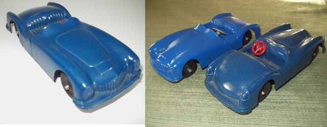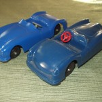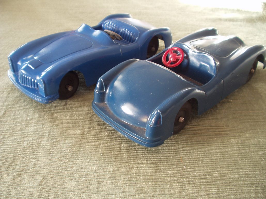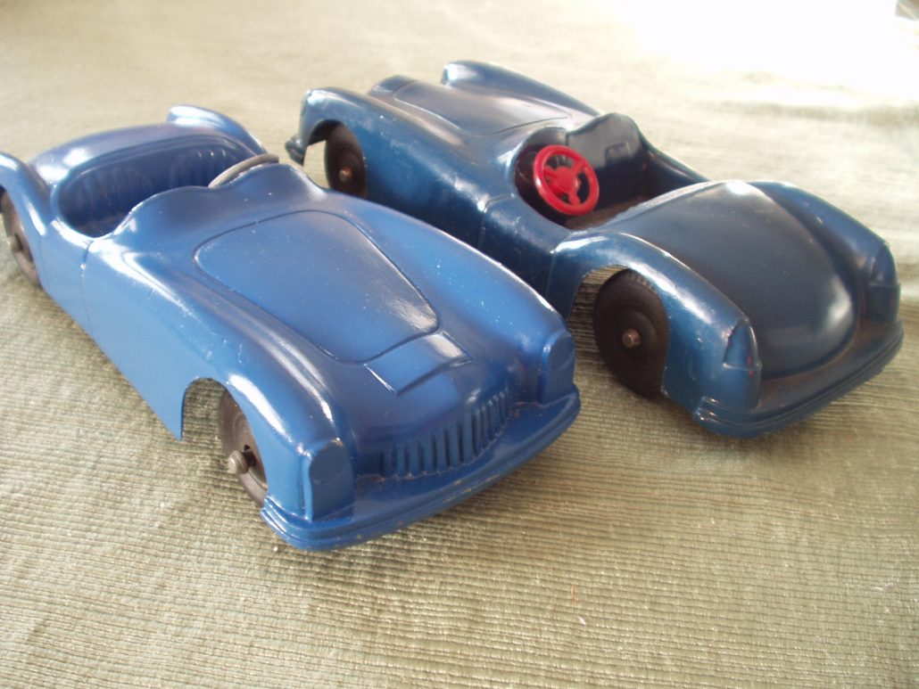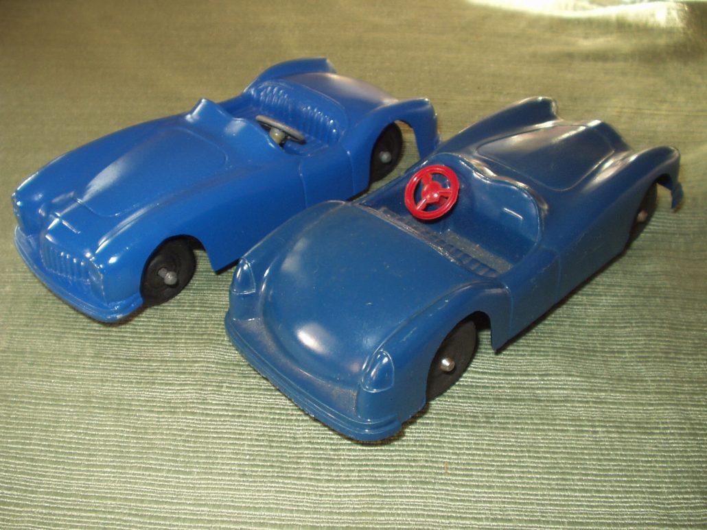 The blue paint is a slightly different shade. Both appear to be as originally produced, including the paint. Construction is typical of dime store toys of the late fifties. One car has plain tires, the other has tires marked “Louis Marx & Co Made in USA” on the sidewalls.