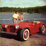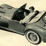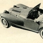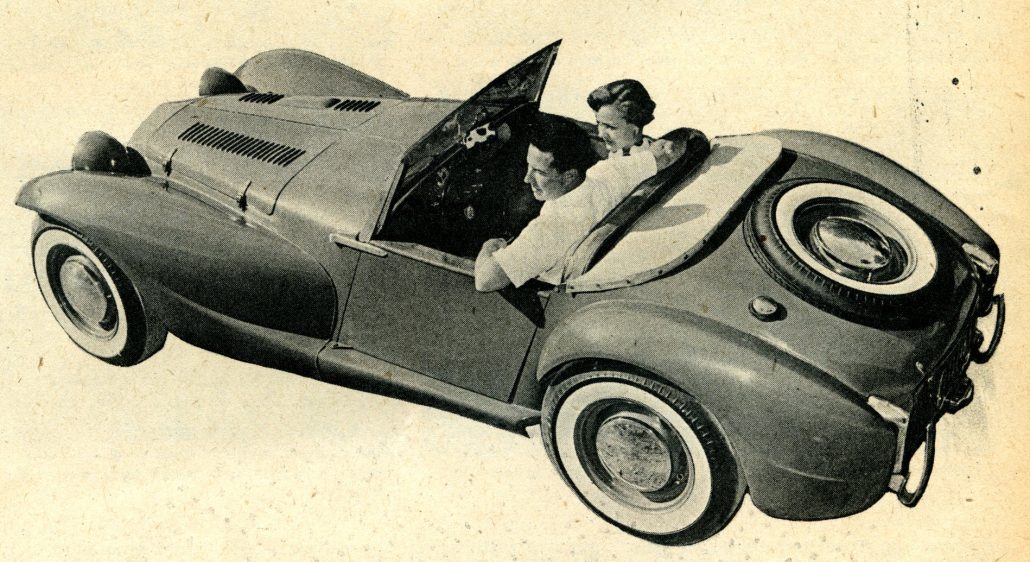 Bill Tritt, President of Glasspar, fathered the first commercially produced plastic car body back in 1951. Continuing research in reinforced plastics, still underway even today, resulted in new mechanical and styling techniques not considered practical at first. Unlike previous Glasspar models, usually molded in one-piece. the Ascot has readily detachable and replaceable fenders and weather-tight roll-up windows. The folding top stores behind the seats, affording exceptional visibility when up. The weatherproof luggage space in the trunk will accommodate “two-suiter” bag and tools.