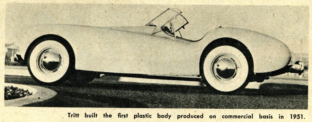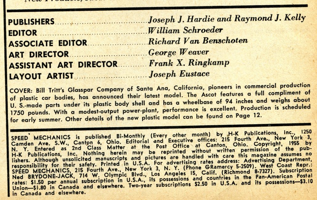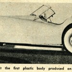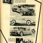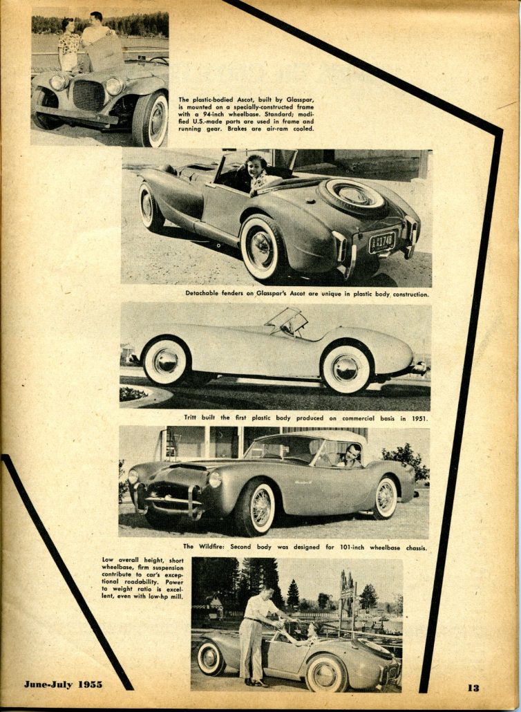 “Cover: Bill Tritt’s Glasspar Company of Santa Ana, California, pioneers in commercial production of plastic car bodies, has announced their latest model. The Ascot features a full compliment of U.S. made parts under its plastic body shell, and has a wheelbase of 94 inches and weighs about 1750 pounds. With a modest-output power-plant, performance is excellent. Production is scheduled for early summer.”