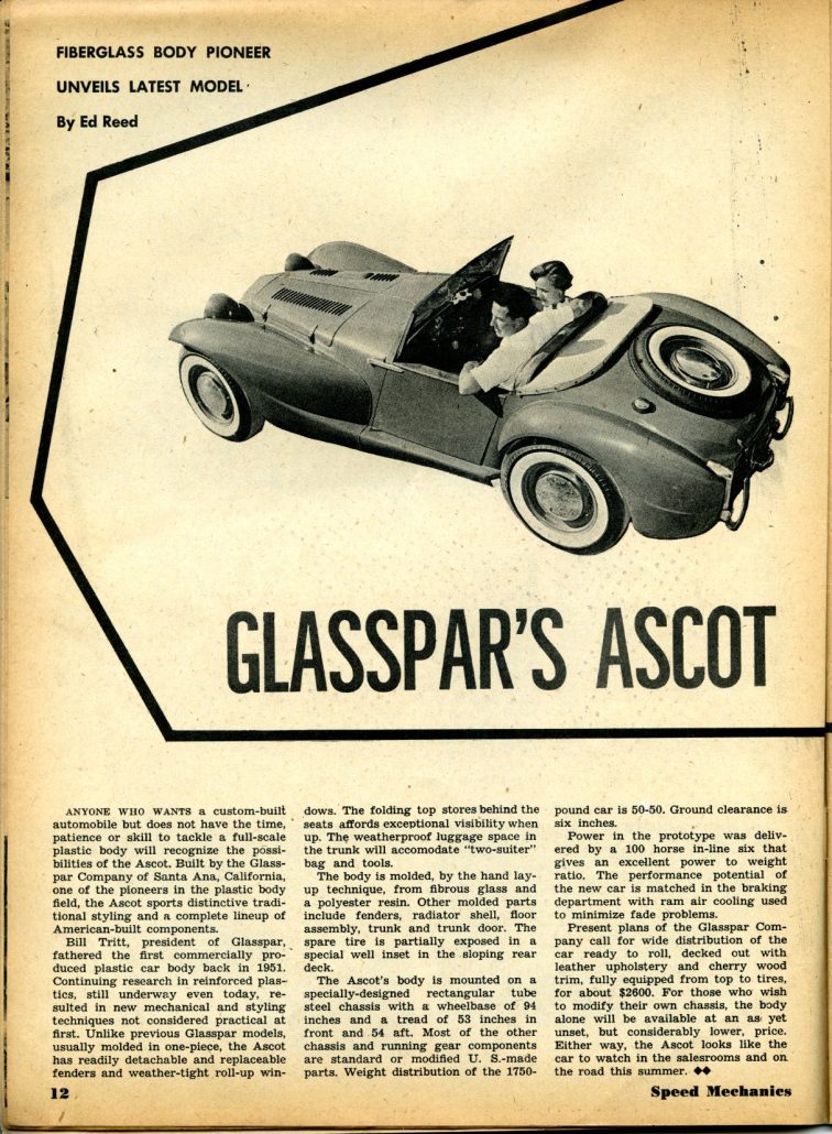 Glasspar’s Ascot – Fiberglass Body Pioneer Unveils Latest Model (Speed Mechanics, June-July 1955)