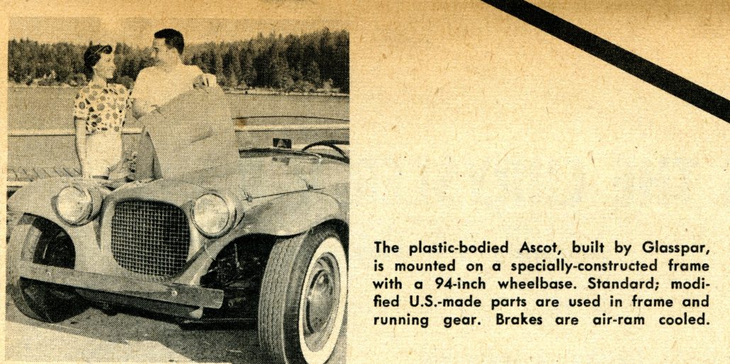 Caption Reads Here, “The Plastic-Bodied Ascot, Built By Glasspar, Is Mounted On A Specially-Constructed Frame With A 94 Inch Wheelbase. Standard; Modified U.S. Made Parts Are Used In Frame And Running Gear. Brakes Are Air-Ram Cooled.”