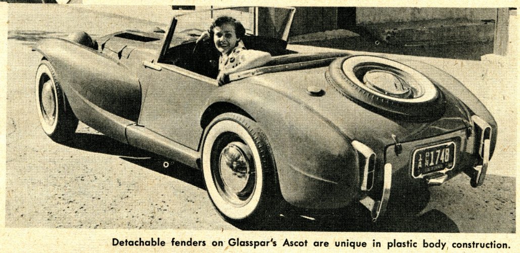 Caption Here Reads, “Detachable Fenders on Glasspar’s Ascot Are Unique In Plastic Body Construction.”