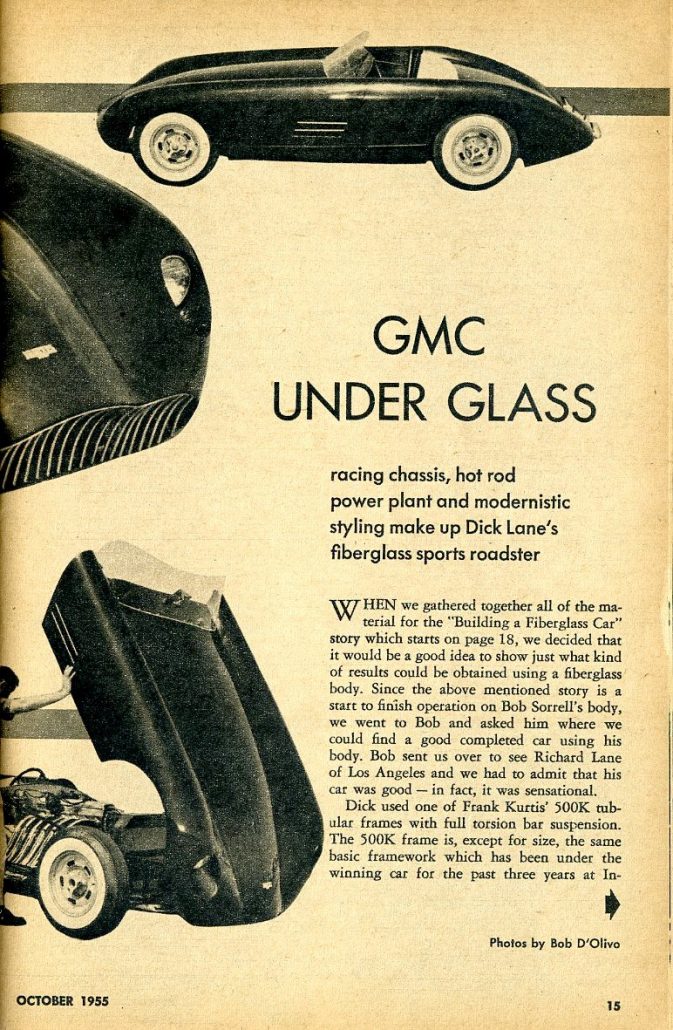 Bob’s first fiberglass body debuted in ’53 and here it was late in ’55 and he already was on the cover of a magazine. In fact, as you’ll read below, Car Craft Magazine used Bob’s work and expertise in the creation of another article – one that appeared over 3 issues of Car Craft starting in October 1955 – and we’ll feature that series of articles in the future here at Forgotten Fiberglass.